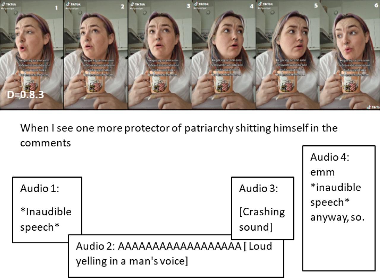 Humour, irony, and ridicule play a significant role in the overall Öfgar rhetoric, as shown in as shown in Figure 2 in a video titled “In One Ear, Out the Other”. This video exemplifies how an audio meme functions as a component in a metaphorical narrative to ridicule the rhetorical adversaries of the Öfgar group or those described as defending patriarchy. The audio meme is a loud yell in a masculine voice and ends in a thumping sound, indicating a body crashing against a wall. The narrative consists of a woman with a cup in her hand, sitting at a table, drawing a parallel imagery of a woman sitting at a kitchen table while conversing with a friend over a cup of coffee. A sudden yell (audio 2) interrupts the conversation (audio 1), the woman looks up, following the trajectory of a moving object above her with an attentive expression (mouth open, other facial features slack). After it crashes (as indicated in audio 3), she stills her body for a few seconds (frame 5), but then she turns her head (frame 6) and continues the interrupted conversation.