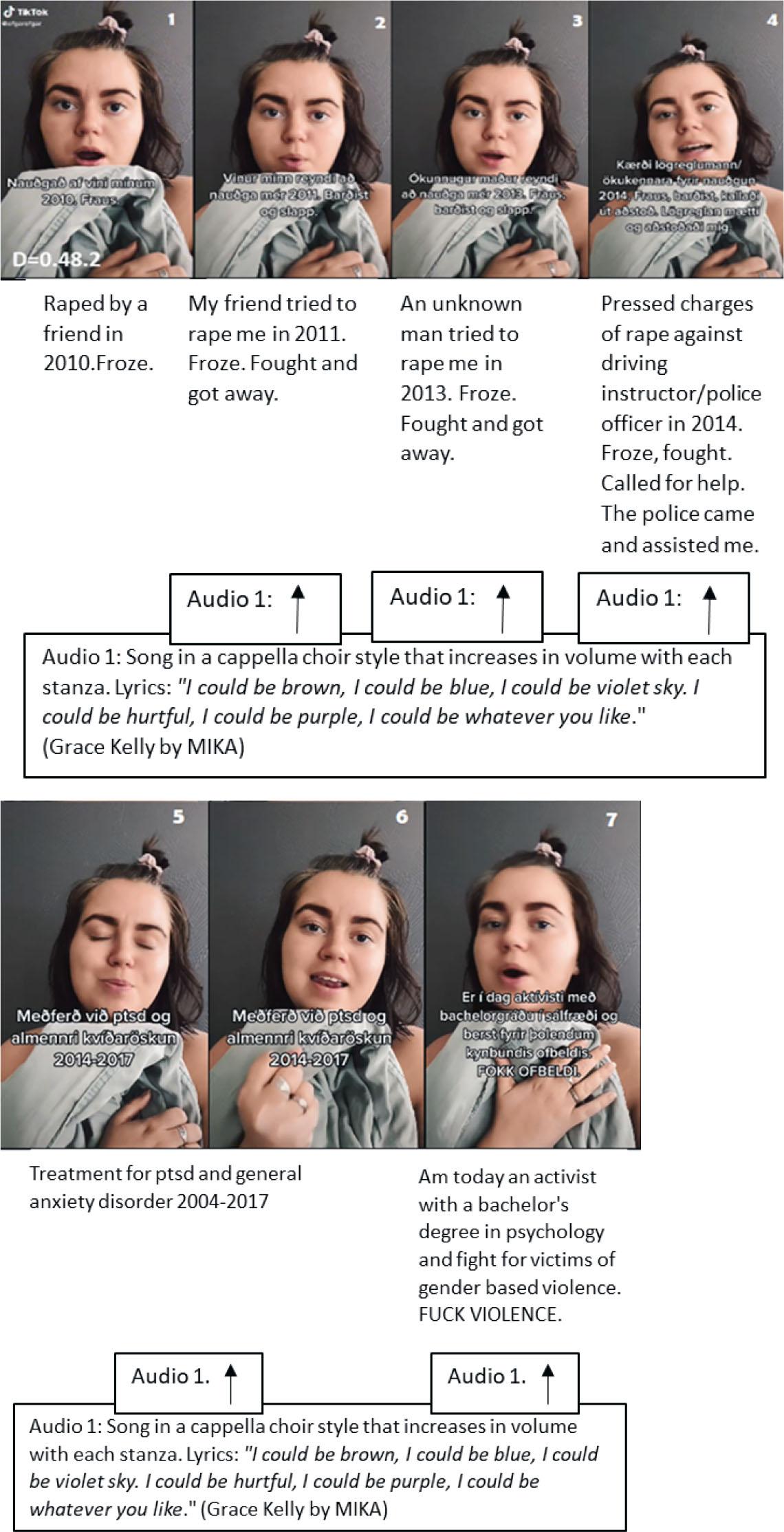 In an effort to frame feminist activism as a positive and rewarding endeavour, the members of Öfgar produce videos in which they aim to inspire and become role models for others. This rhetorical act is exemplified in Figure 3, where a member of Öfgar chronicles her traumatic experiences of gender-based violence and her reactions across six separate subtitles, while mouthing to the lyrics of a song. In this video, the change in the body is marked by its sequentially increased movement and peaking in certain gestures. During the playback, a song performed a cappella increases in pitch and volume (with more voices joining the singing) and its expressive tonality parallels the increasing movement and gesturalism of the narrator. The highest tonal pitch in the music is reached in frames 6 and 7 in conjunction with the peaking of involvement that is manifested by moving the hand. The content creator has thus choreographed subtitles, music, and bodily gestures that signal and frame the affective disposition expressed by the iconic face. As the song is only composed of one stanza, the lyrics are repeated six times during the video. The lyrics are about being “whatever you like”, reflecting a changing state of agentic identity, from being a victim to a survivor to an activist. In frame 1, when she begins chronicling her experiences of abuse, her face remains impassive and her body relatively still in comparison to later in the video. Between frames 2–7, the volume of the song increases as more voices join the a cappella, and the narrative changes to fighting, seeking help, and gaining agency. Parallel to these narrative turning points, her body gradually becomes more animated and “peaks” at several intervals. The head starts to move slowly from side to side in a rhythmical “feel” of the music and the story (frame 4), the eyes close (frame 5), the fist is clenched in an emblematic gesture (frame 6), and she begins to gesture with her hand while recounting her recovery (frame 7). Hence, there is a link between gesturing and music (visually expressing what is felt), the narrative trajectory (telling what happened) and lyrics (verbally expressing what is felt).