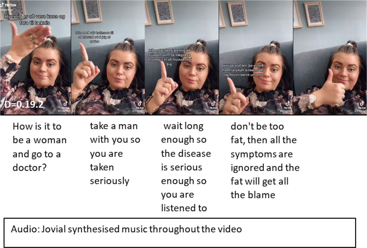 Many of the videos contain stories and examples of how inequality is manifested in society; for instance, in Figure 4, the narrator gives advice to women and non-binary persons on what to do when going to a doctor in order to be “taken seriously”. Throughout the video, the narrator switches between a bemused expression on her face in a form of a smile and pursed lips and a wide smile, and she gestures with her finger rhythmically to the subtitles appearing in each frame while jovial instrumental music is played in the background. At the end of the video (last frame), she smiles sardonically and gives the thumbs-up sign. The changing gestures thus underscore a point being made where the indexical meaning of the turn-opening smile (Kaukomaa et al., 2013) changes and the gesture of the hand works in tandem as it instrumentally points to the subtitles. We now understand the changing state of the body in relation to the subtitles and the jovial atmosphere of the music along with the ontological settings of Öfgar, signalling the affective tone of the encounter. Here, the face is used iconically to express irony: The turn-opening smile and the widening smile in the last frame are not indicators of happiness but rather the opposite, a sign of social-political discontent. The thumb is also used in this ironic sense, as it usually signals something positive, but the indexical reading of the narrative here includes a negative evaluation. The cheerfulness of the music further reiterates this ironic frame.