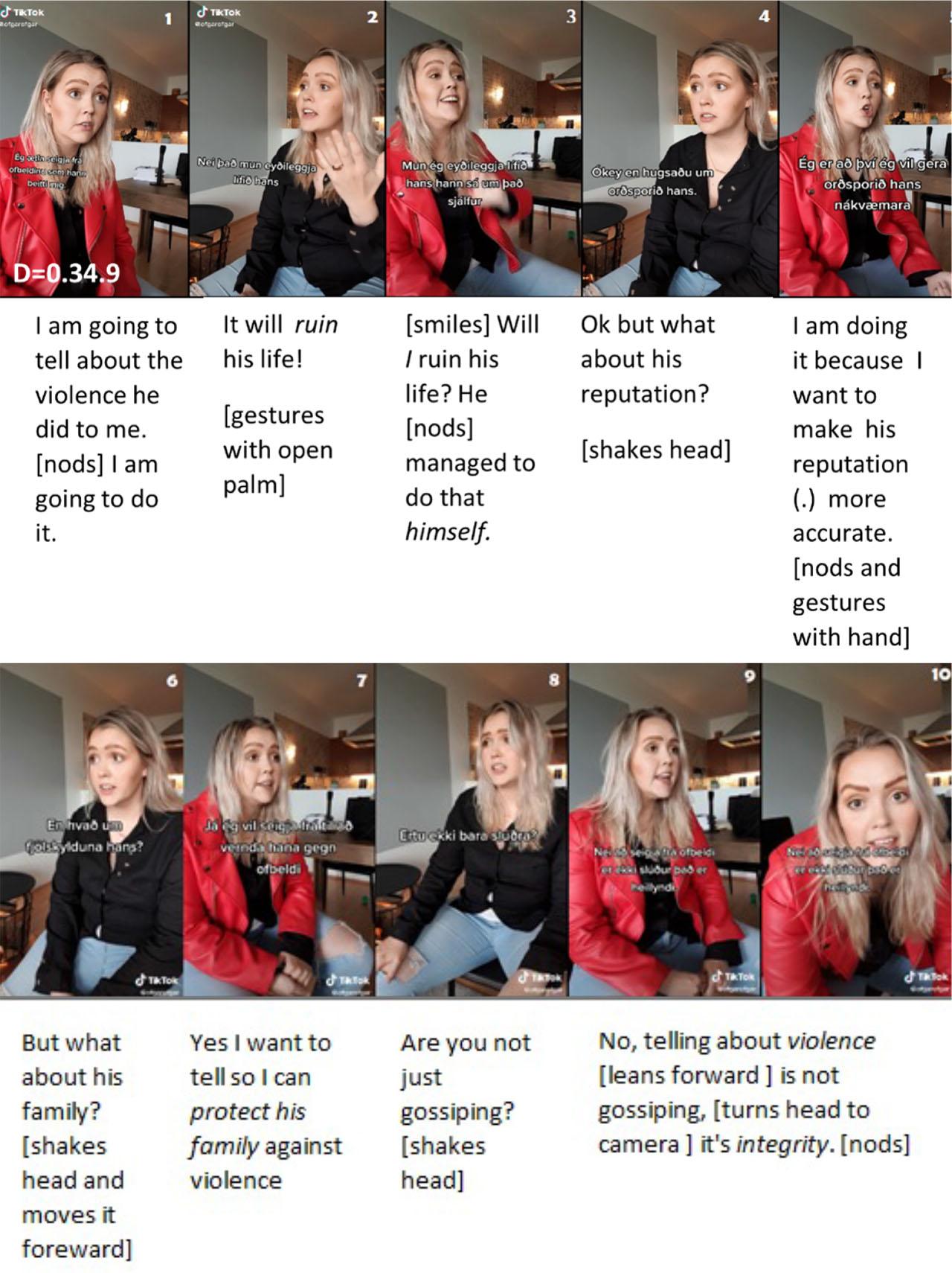 In their efforts to challenge the discursive practices surrounding gender-based violence, members of Öfgar engaged in rhetorical roleplay in many of the videos, where debates were staged between two personas, echoing the voices of diverse ideological subject positions (Rautajoki & Hyvärinen, 2021). Figure 5 exemplifies one such video titled, “Everybody has the right to tell about their own violence”. In this example, the same individual performs the roles of two debaters, and each character presents an opposing view of the justification of disclosing experiences of violence. Here, the sequencing of body gestures in hand with utterances, and the tonality of words, emphasise a critical point in the argument, while the face fluctuates in and out of an emphatic speech style which marks the intensive tone of the entire staged debate. In the first role (frame 1), a narrator wearing a discernible red jacket declares her intent “to tell” about the violence “he” has subjected her to. In the second role (frame 2), another persona, “a protector”, tries to dissuade the first speaker via various arguments. This staged interaction is rhetorically managed via the change in bodily positioning – the peak of gestures performed in sequential order and in sync with utterances and subtitles (the subtitles in the video are a textual representation of the audio speech). For example, in the last frame (frame 10), the narrator (now out of character) turns to the camera, leans forward, and addresses the audience directly. The tonality of voice expresses incredulity by pitching voice higher (frames 2 and 3). Voice also expresses rationality at other times by maintaining a flat and steady level of tonality without inflections of anger (frame 2). Moral positioning is also communicated through tonality of voice by emphasising certain words (e.g., in frame 3, “will I ruin this life?”, and frame 7, “Yes I want to tell” and “telling about violence is not gossiping it's integrity”). Here, peak of involvement is signalled by a tonal change and emphasis that underscores the moral accountability of actors, for example, the refuting of the statement that “I” will ruin his life when it was “himself”.