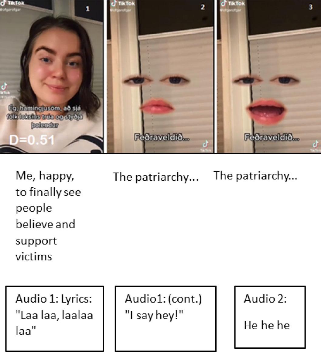 In the final example, we show how the Öfgar movement exerts effort to embody social institutions, such as feminism, rape culture, and patriarchy. Understanding body gestures here is dependent on their sequential presentation, the peak of involvement, and the juxtaposition of identifications. In Figure 6, the activist in the first frame tilts her head slightly and gazes smilingly at the camera as the peak of affective engagement. The subtitles describe her as feeling “happy” to finally see people believe and support victims. During the video, upbeat music is played and carefree lyrics of “la la la la” are heard, further signalling the affect of joy (audio 1). The frame then switches to a new persona with only two eyes and a mouth, identified by the subtitles as “Patriarchy”, and at the same time the lyrics in the song change, reflecting the sudden introduction to the new face (“I say hey!”). In the third frame, “Patriarchy” then starts to laugh (audio 2). The video is an interesting example the metonymic use of the body and face, where the face represents the whole of social institution: happy feminism and malicious patriarchy that has a quality of omnipotent presence. On the iconic level, both faces display a state of “happiness” – a sense of enjoyment with the current state of affairs. Indexically, it can be inferred in a cause-and-effect relation, that the happiness of the first speaker is disrupted by the abrupt entry of Patriarchy who then laughs (frame 3, audio 2). As Patriarchy is identified by Öfgar as a malignant social institution, the laughter takes on a malignant quality, signalling a stance against victims and a malicious intent (to disrupt support and credibility). Patriarchy is thus identified here as a personalised adversary with ekphrastic affordances of a face that expresses gleeful maliciousness. Symbolically, the video stages the cultural antagonism that the members of the movement must “face” (here presented in the form of faces). This example acutely illustrates the symbolic relevance of the face as a site of political signification in a medium like TikTok. The face embodies the affective stance of institutional bodies, which exist dynamically aside one another, rendering micro practices of inequality intensely personal and visual, as something that exists as an antagonistic relationship between physical bodies.