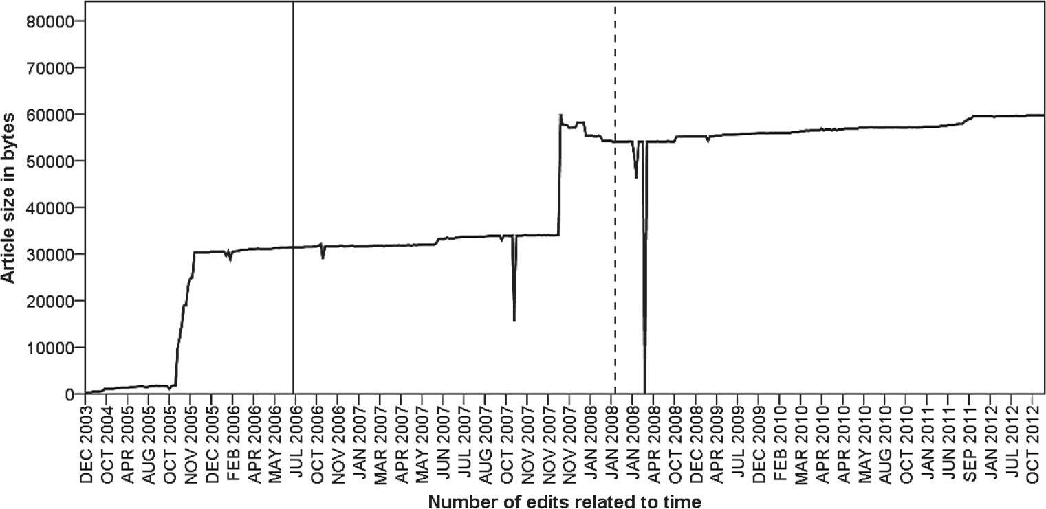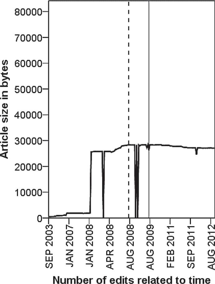 After receiving the award in May 2008, the article remained unmodified for three months. In August, however, an anonymous user inserted some random characters and obscene words into it. The vandalism was soon detected, but the same kind of vandalism occurred several times during the autumn. Obscene words and sentences were not simply inserted into the text; the whole content was removed from the article twice. In Figure 2 the V-shapes on the line indicate the removal of text and the restoration that followed. This particular kind of vandalism is called blanking on Wikipedia. Apart from the vandalism, the article had now stabilized.