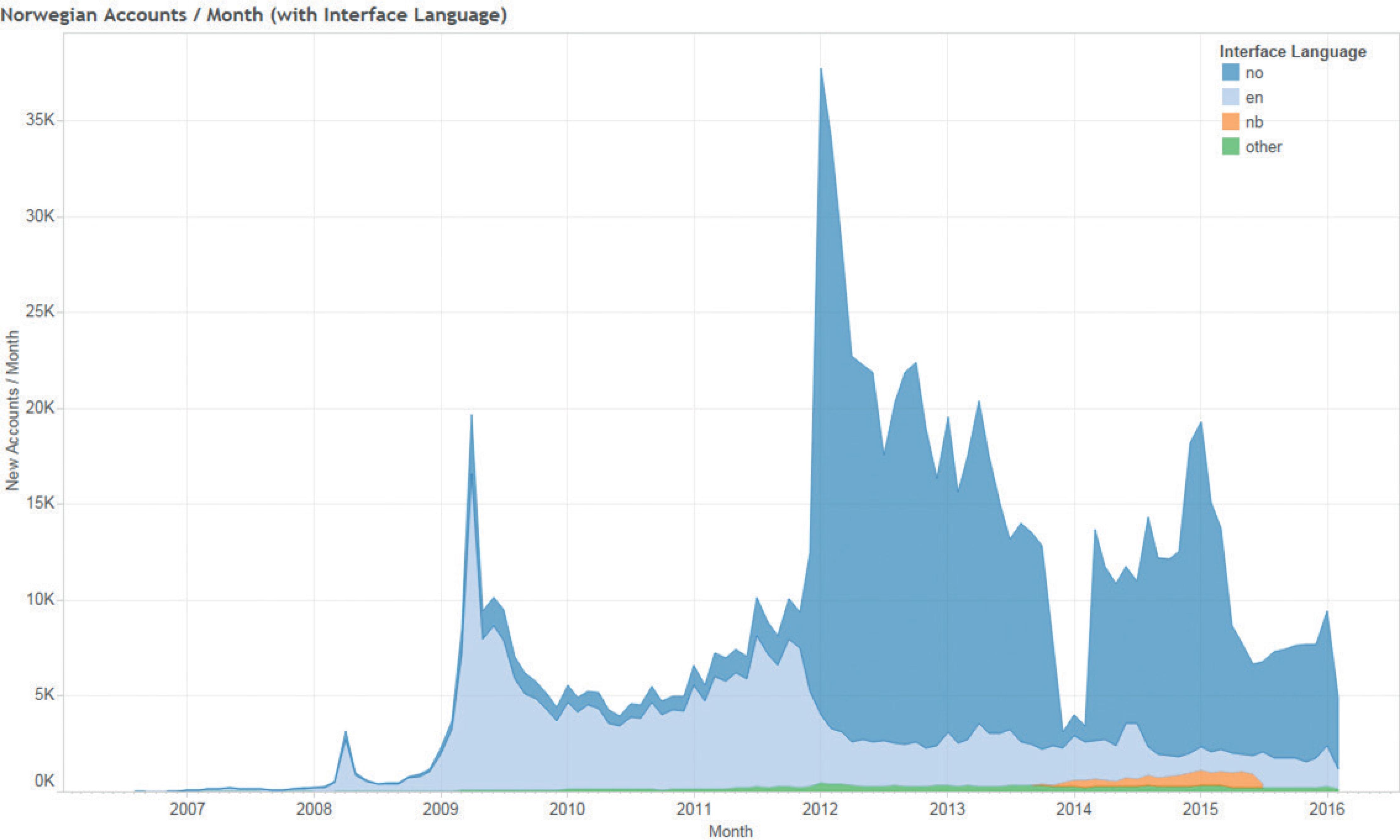 Early in 2012, however, Twitter experienced another, even more substantial and rapid influx of new Norwegian users. It is notable here that – unlike the earlier cohort – the vast majority of accounts created from this point onward are today using Twitter with a Norwegian-language Web interface; it is almost certain, therefore, that this new influx is related to Twitter’s launch of a Norwegian interface on 21 December 2011 (@twitter 2011). (The small percentage of older accounts that are now using a Norwegian interface language setting would have switched to Norwegian between December 2011 and our data gathering in 2016.) This pattern demonstrates that even for a country such as Norway, with a population widely able to read and write English, the availability of Twitter in the native language still makes a considerable difference for the platform’s popularity; additionally, of course, it is also likely that such adoption would have been boosted by contemporary Norwegian media reports about the new availability of Twitter in Norwegian. From 2012 onwards, therefore, the total number of new Norwegian accounts created each month rose substantially, and remained at a comparatively high level until 2015; the number of new Norwegian accounts using Twitter in English, by contrast, dropped substantially from its pre-2012 levels.