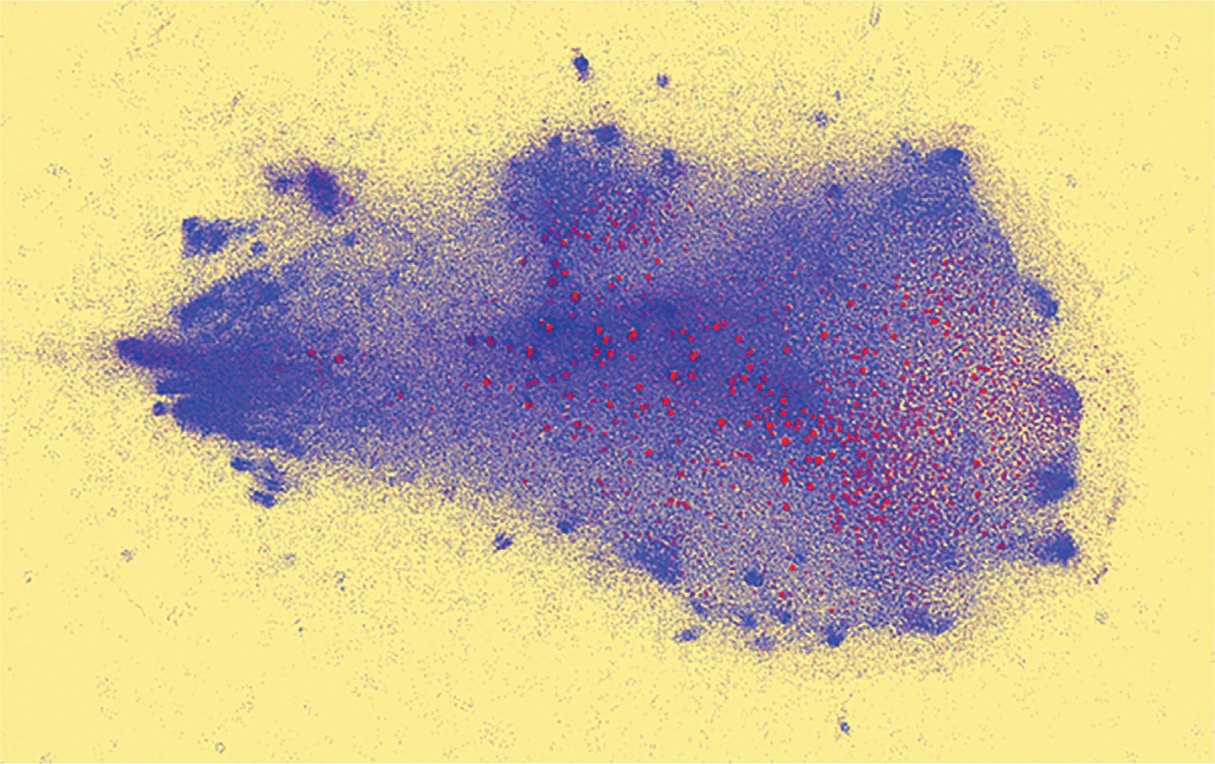 Norwegian Twittersphere network. Edges not shown. Nodes positioned using Force Atlas 2 algorithm in Gephi (Jacomy et al. 2014); node colour gradient from blue to red represents increasing number of followers.