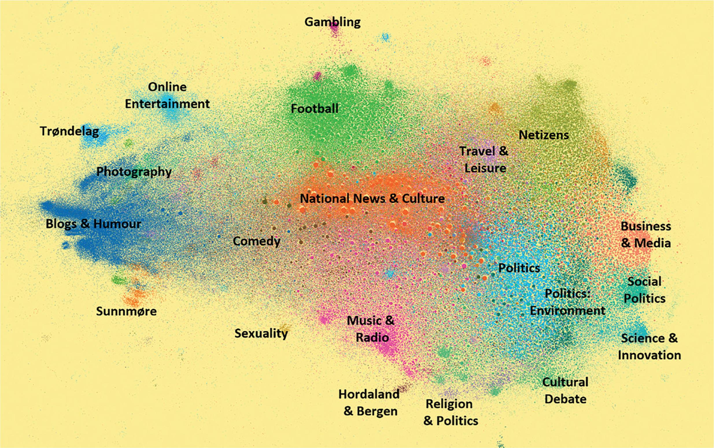 We note again in this context also that our analysis of the connectivity patterns within the Norwegian Twittersphere extends well beyond the focus on political echo chambers that is common to many other studies. We take instead a broader approach to the ‘echo chamber’ concept, looking for comparatively isolated communities on any topic – and finding few that match this description. As we use the term ‘echo chamber’ in the present discussion, then, we use it to refer to communities of shared topical interests, rather than necessarily of shared sociocultural beliefs or political ideologies. At the same time, we do note that those clusters which address overly political interests are also internally well-connected, with more than 80 per cent of accounts in any of these political or policy clusters being followed by other cluster members: we therefore do not find any strong evidence of internal polarisation within these clusters either. (Such observations could be extended through further analysis of the specific network structures within each of these clusters, which the available space for the present article does not permit us to present here.)