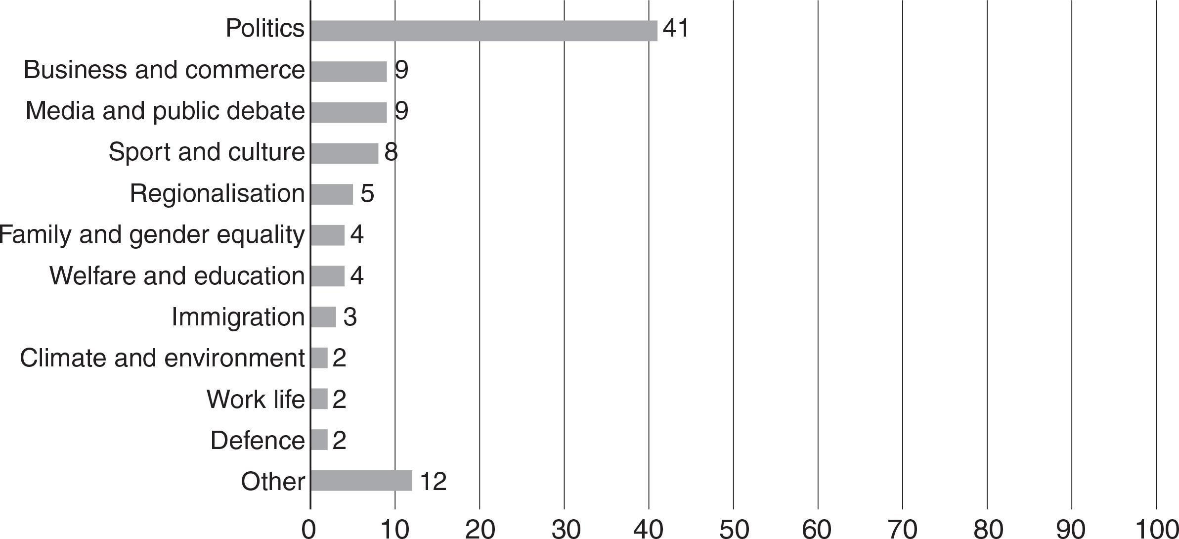 The categories are politics, business and commerce, media and public debate, regionalisation, family and gender equality, welfare and education, immigration, climate and environment, work life, defence, and other.