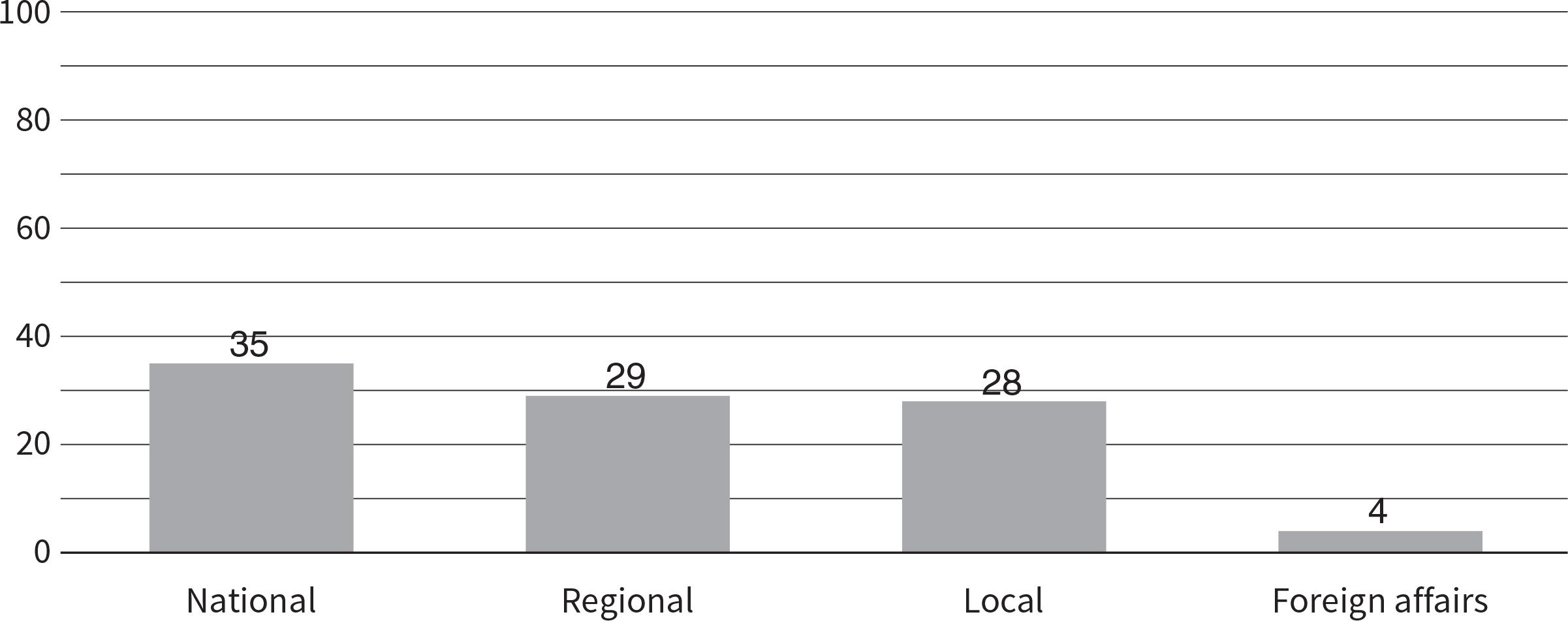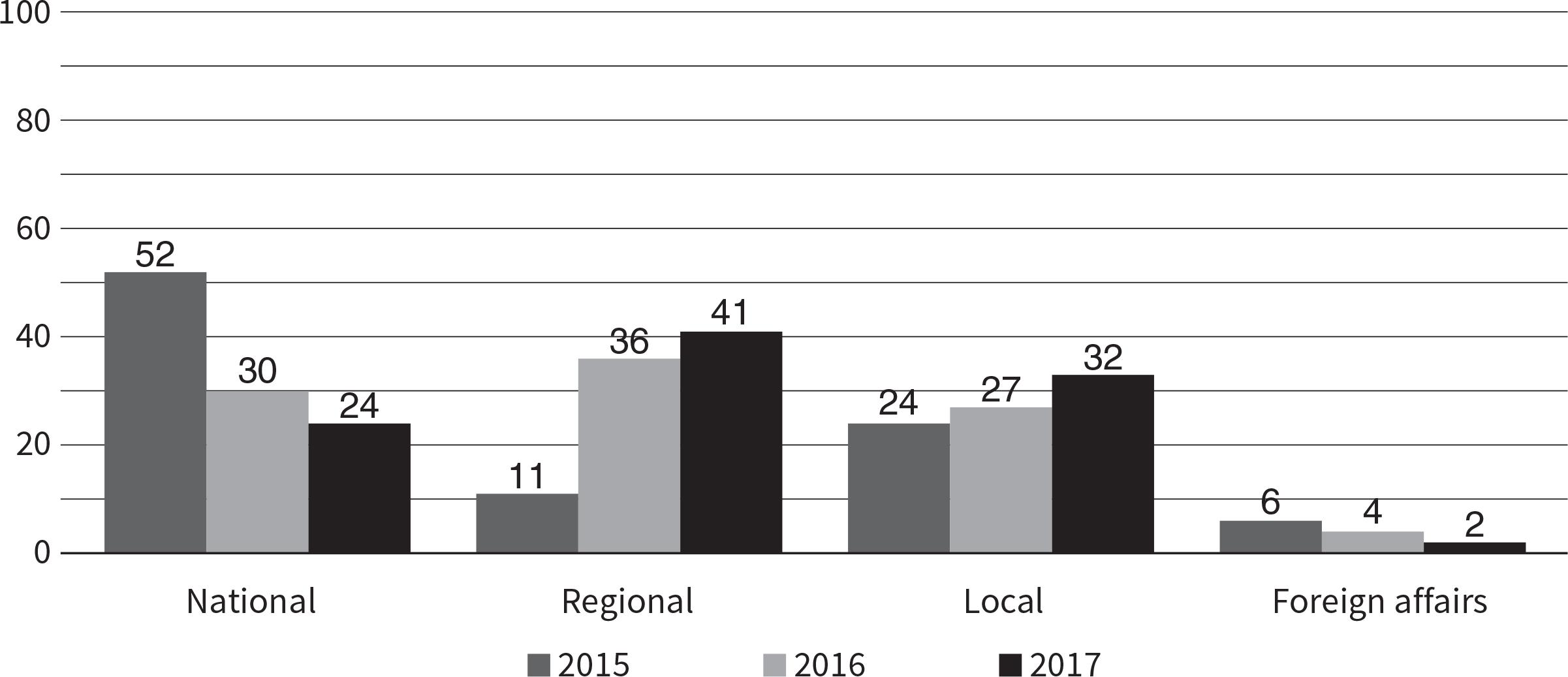 Figure 4 reveals that regional focus has increased from 11 per cent in 2015 to 41 per cent in 2017, which is a significant increase. The results also show a slight growth in the columns focusing on local issues, from 24 to 31 per cent, whereas the national scope is halved with a decline from 52 in 2015 to 24 per cent two years later.