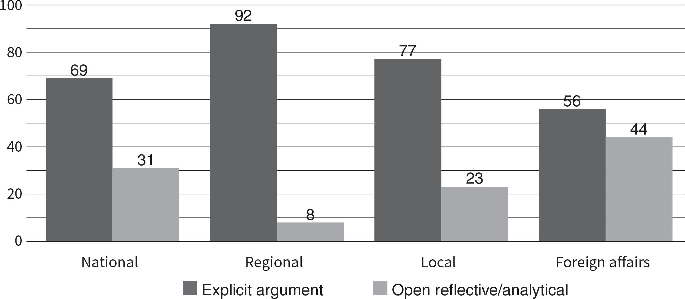 As one can see, the columnists most often convey an explicit argument or viewpoint in regional issues. A total of 92 per cent of the columns with a regional anchorage express a clear view or argument, whereas only eight percent of them are formulated in a more reflective and open style. The columnists in Nordnorsk debatt facilitate the regional public by playing a role in which they convey explicit opinions and arguments. This might also contribute to public engagement and participation, as explicit stances often provoke either protest and reactions or support and agreement. The results also show that a more open analytical approach is most often used when the columnists are addressing foreign affairs. However, this category is rather small and will not be discussed further.