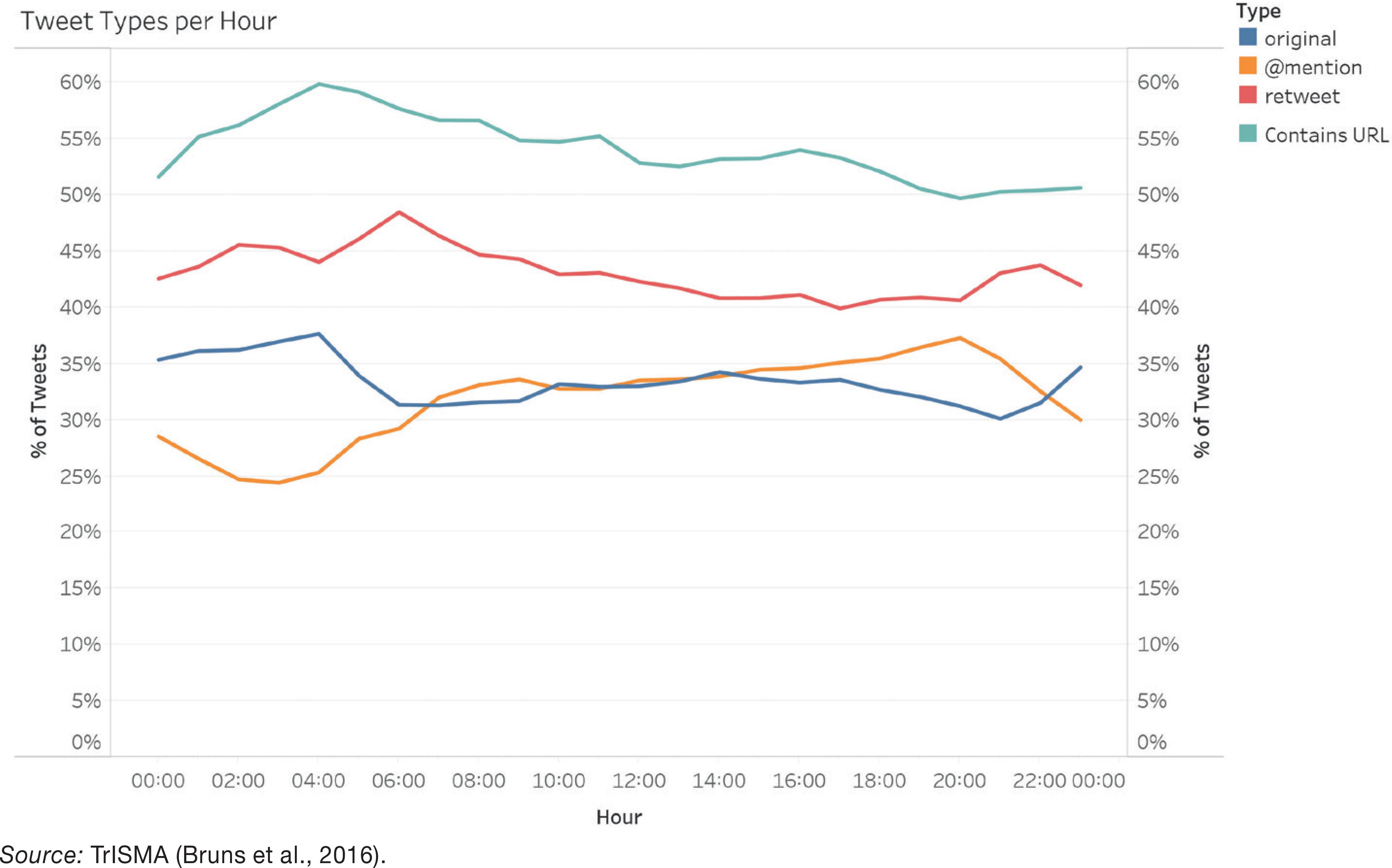Conversely, information sharing via retweets reached an early peak of 48.48 per cent of all tweets after 06:00 and then declined rather steadily; the late evening hours experienced a new increase (to 43.77 per cent after 22:00). This may relate especially to news reading and sharing; as users come online in the morning, they catch up with the news and retweet a proportion to their followers; similarly, as they end their day, they again engage especially with the latest news from Europe and North America, where the day is now underway. This is somewhat supported by the patterns of URL sharing: at 59.88 per cent, the hour after 04:00 accounted for the greatest percentage of URL tweets, declining to 49.72 per cent after 20:00. The increase in retweeting in the later evening did not coincide with more tweets containing URLs, however. Notably, tweets containing twitter.com URLs remained remarkably stable throughout the day, fluctuating only between 26.77 per cent and 29.82 per cent; any change in URL tweets was driven almost entirely by tweets linking to external content.