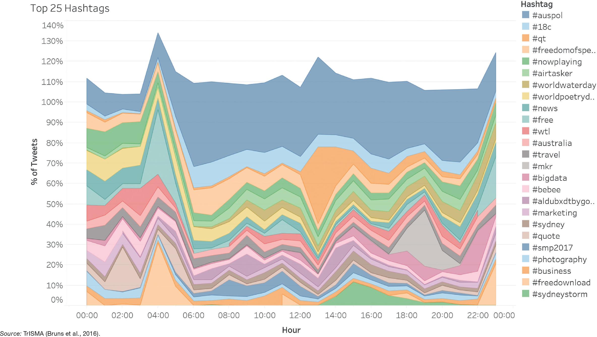 A handful of other hashtags appeared at more specific times. Between 14:00 and 18:00, #sydneystorm waxed and waned as a major weather front moved across the greater Sydney area; such weather tweets are common in Australia, which is subject to major weather events, including cyclones, floods and bushfires. Between 18:00 and 21:00, the night’s broadcast of the reality TV show My kitchen rules attracted a substantial number of participants to its “official” hashtag #mkr, demonstrating the use of social media for second-screen engagement.