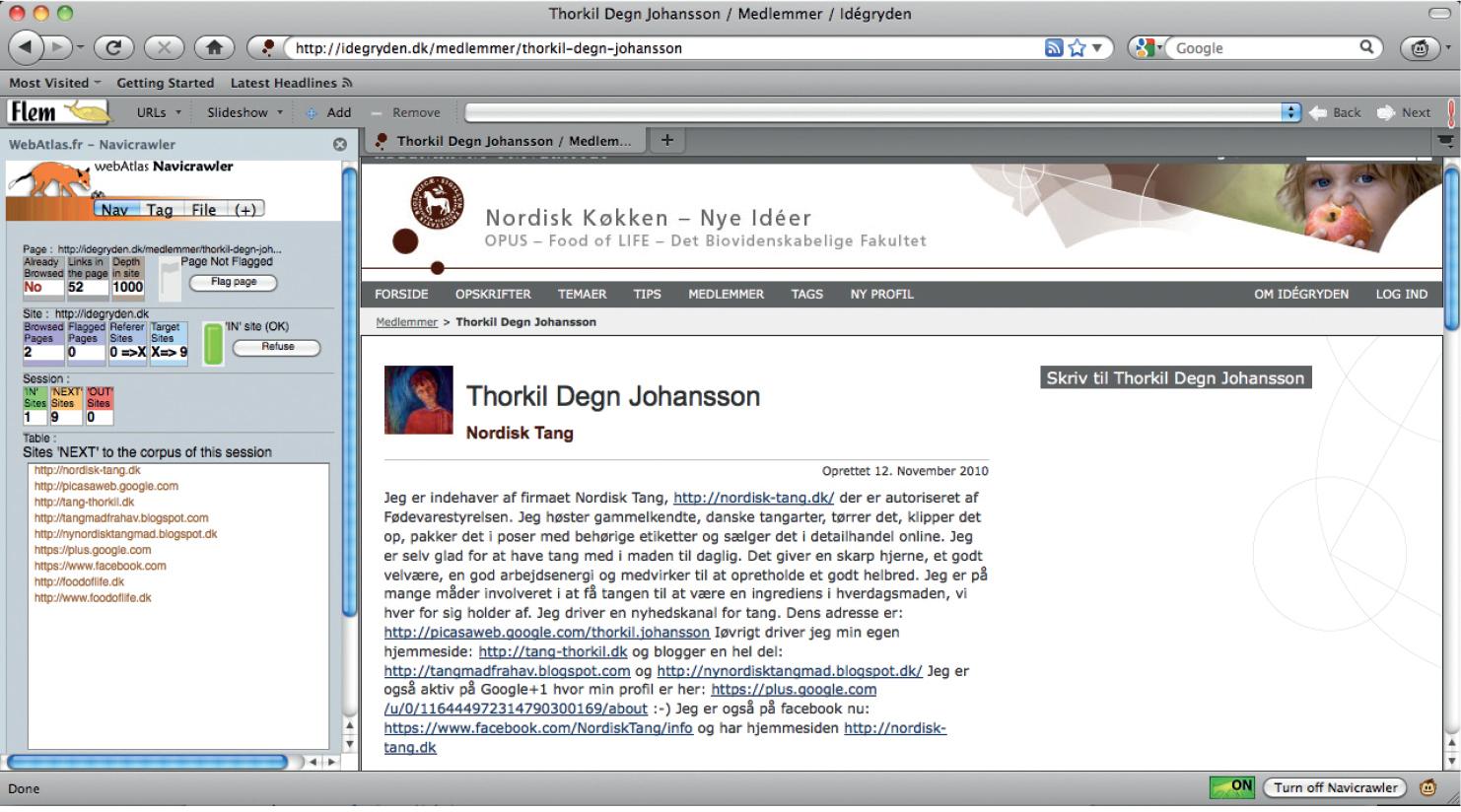 The difference between a complementary approach and a single level of analysis approach can again be illustrated through the example of the New Nordic web corpus. One of the interesting features of this corpus is a particular group of tightly connected websites that display an intense interest in seaweed. A complementary approach could notice this feature on the macro level through quantitative techniques and then attempt to make sense of it on the micro level through in-depth qualitative work. Figure 4 shows a screenshot from one of the websites in question. It allows us to situate the seaweed talk in context, in this case on the profile page of a participant in the OPUS research project who nicknames himself “Seaweed Thorkil”. We can for example begin to build an interpretation that involves arguments about the health benefits of seaweed (which makes it particularly interesting to actors carrying out research on the New Nordic Diet) and its value as a sustainable food source.