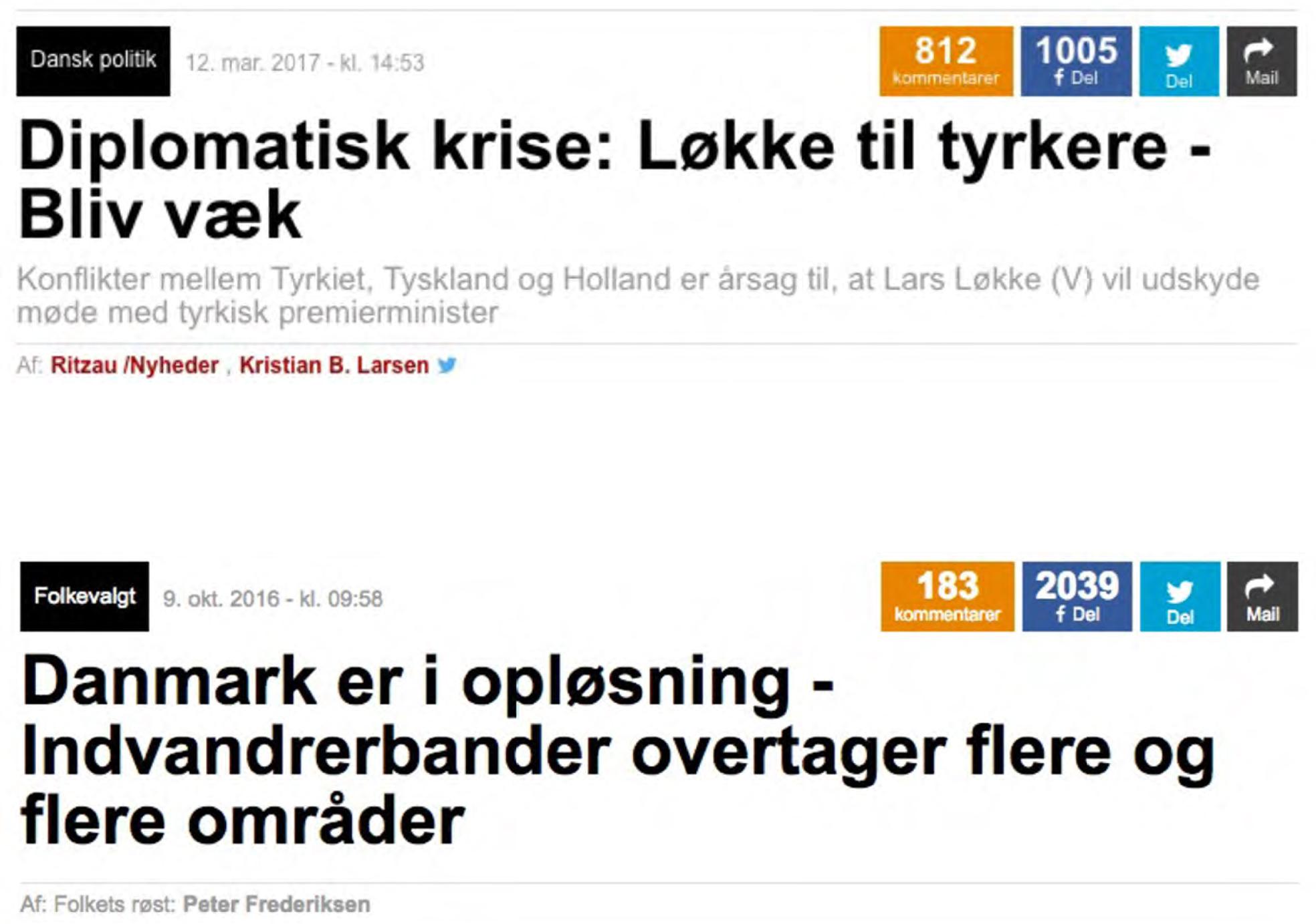 The combination of visual layout of The People’s Voice’s, Ekstra Bladet’s insistence in treating The People’s Voice as an opinion page, and the ability of such to travel through social media in the guise of news articles written by professional journalists, created a hybrid news format. This format represented personal opinions of users but could be fashioned into a journalistic news genre and referred to as such. The technological infrastructure was thus not only provided by The People’s Voice but also by Ekstra Bladet and social media platforms. Combined, they created an infrastructure where letters were shared as newspaper articles and strategically quoted and used to legitimise and normalise racism through “borderline discourse” (Krzyżanowski & Ledin, 2017: 567), as we will unfold in the following sections.