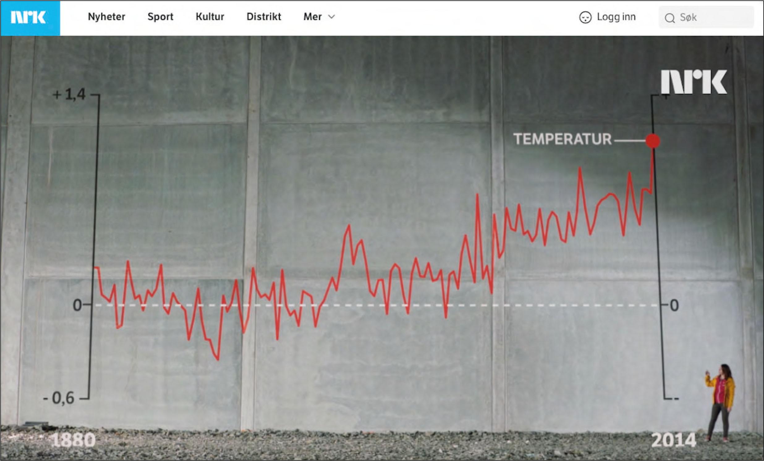 The text material applied in the reading sessions consisted of four text units; two were based on video and two were static with various data visualisations integrated. Hereafter, they are referred to as “videos” and “static texts” (although the static texts also include smaller animated elements). Climate change was chosen as a topic because it is a social and political issue most people can relate to and, at the same time, public communication of numeric data plays a significant role. All the text units are published on the NRK (the Norwegian national broadcaster) website on pages designed with a video on top and corresponding static text directly below.