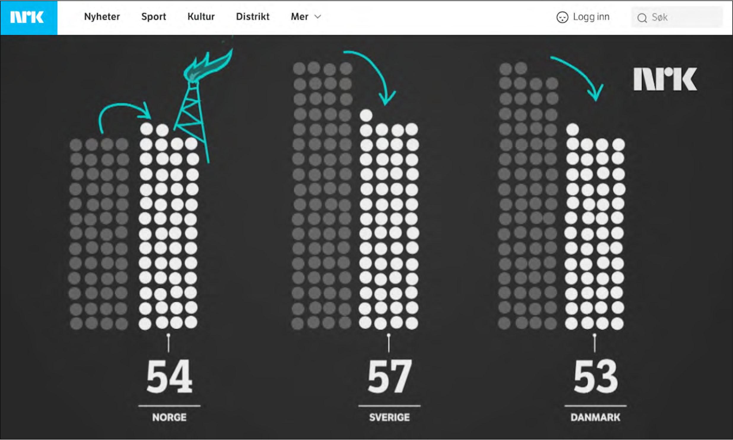 Data visualisation (DV) represents a text type growing in prevalence and impact in many cultural domains. A broad variety of graphs, charts, and maps – sometimes in animated and interactive forms – is found in the fields of journalism, business, education, strategic communication, and so forth (Cairo, 2016; Kennedy et al., 2016a). Some DVs are produced in simple and highly conventionalised forms, their codes presumably more or less intuitively perceived by their target users. Other DVs are more complex in form and content, and thus more demanding for users to decode and make sense of (Engebretsen, 2017). Research on DV reception is, however, scarce, and the impact that specific design elements have on the reception process is an issue calling for closer investigation.(1) This article contributes to the empirical investigation of DV reception, focusing on young students’ interaction with DVs found in the news media.