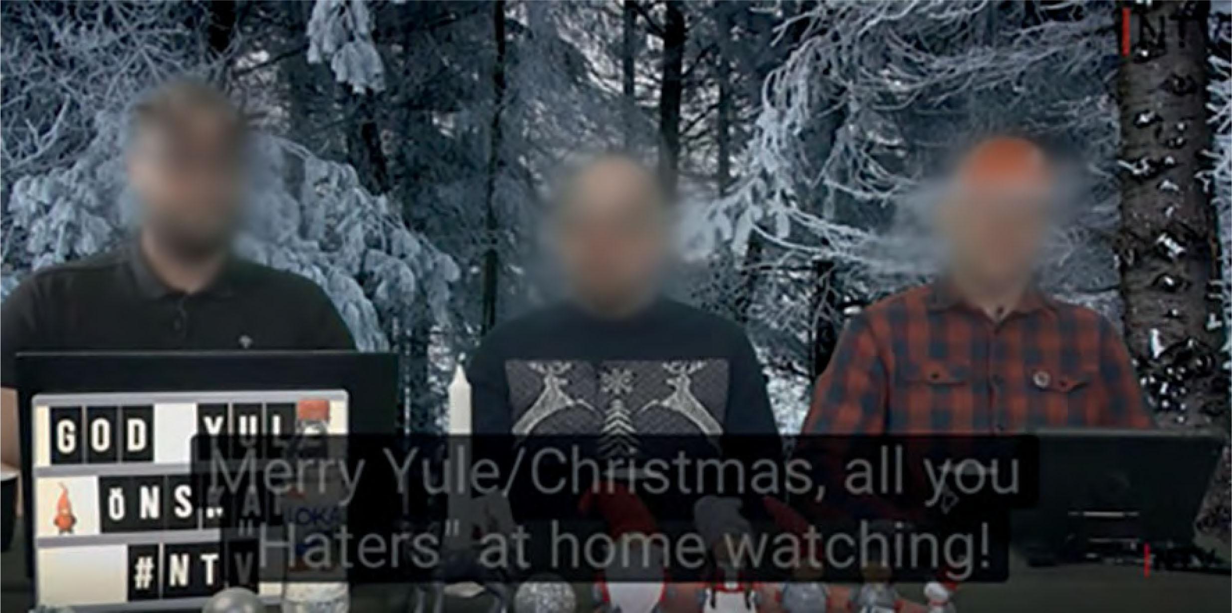 Figure 2 shows an NRM member with one of the actual hosts of the original television show, Arne Weise, edited into the screen. In Figure 3, the three hosts open the show. The subtitles read “Merry Yule/Christmas, all you ‘Haters’ watching at home!” With their neo-Nazi version of the show, they celebrate rather than ridicule the format, which is hailed by many viewers as a dear tradition and a cultural treasure encapsulating Swedish culture. With this appropriation, they mimic a mainstream cultural institution and re-inscribe new meaning onto a longstanding and popular tradition in mainstream Swedish television culture.
