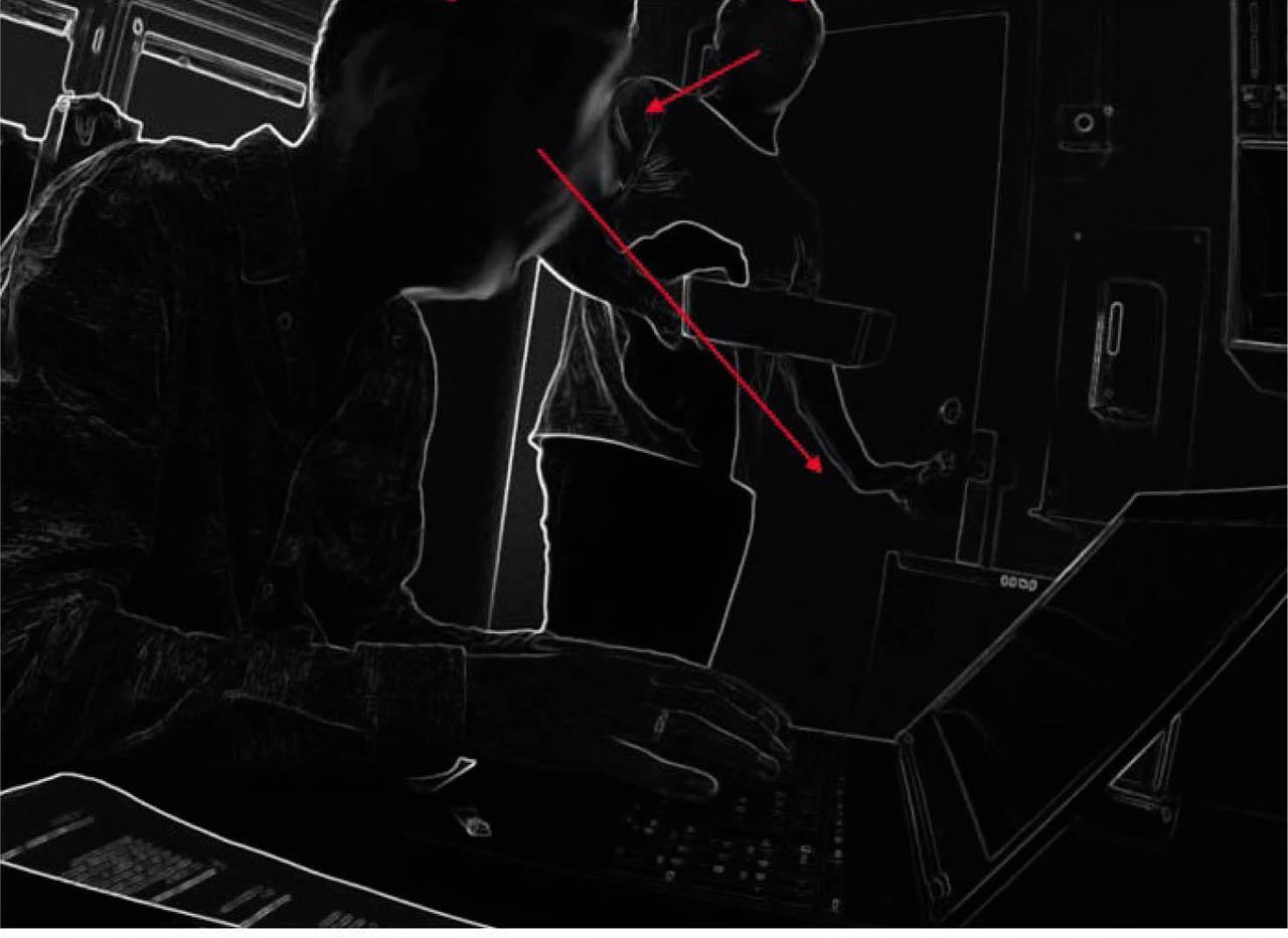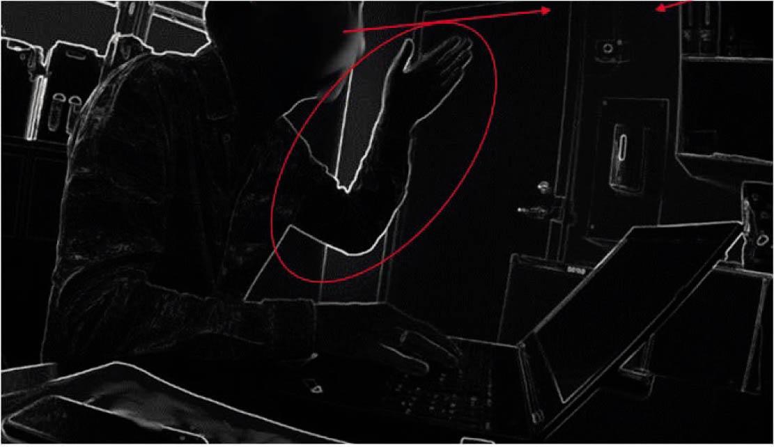 Comments: In this image, D1 (who sits at the laptop) gestures toward D2 (who stands out of the camera frame beyond the upper-right corner of the image) while synchronously verbalising the digital function “ticking the wings”. D1's gesture works as a reenactment of a shape similar to the “√” symbol in the system.