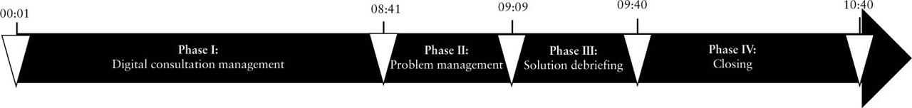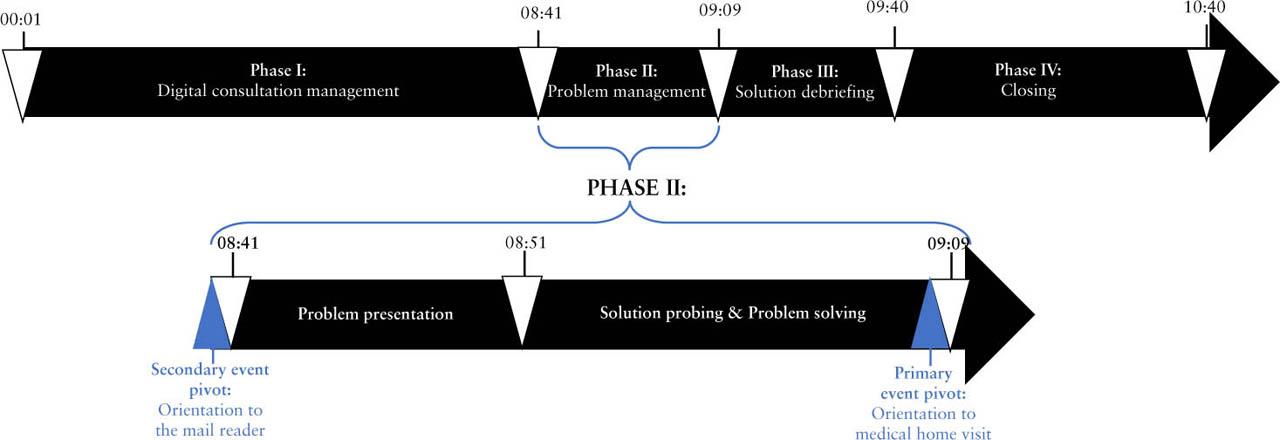 Comments: The white triangles illustrate the points in time where salient interactional transitions emerge. In Phase I, D1 manages digital consultations alone in the breakroom in silence. Phase II commences as D2 enters the room. Although D1 continues to manage digital consultations, he distributes his attention between these and D2 as he declaratively asks, “and you are the mail reader?” This prompts the two doctors to engage in the stage of problem management. In Phase III, the two doctors elaborate the solution they found in Phase II, and finally, in Phase IV, the interaction closes.