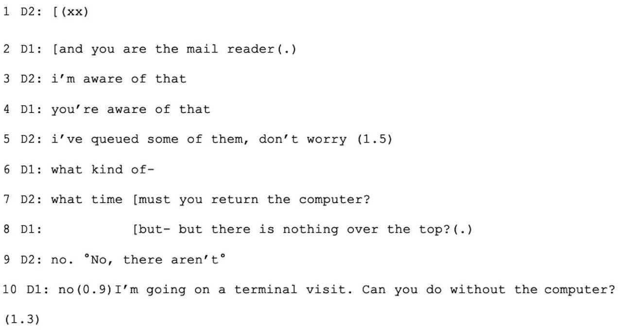 As D2 responds to D1's request (line 11), he allows D1 to take the computer, saying “All right, then (2.1)”: