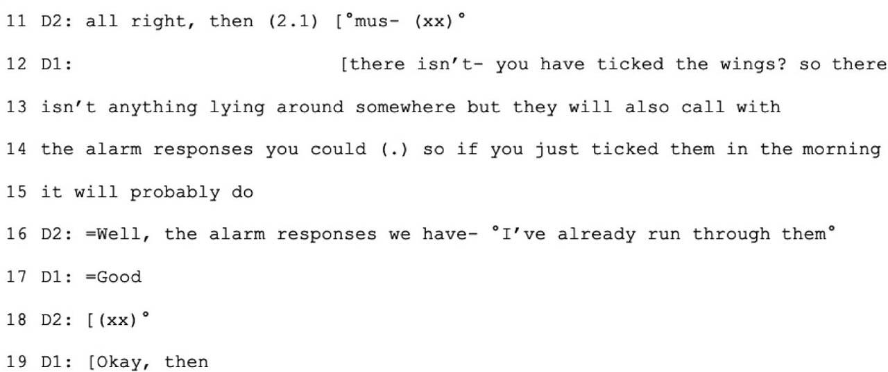 The negotiation problem is solved as D2 replies “=Well, the alarm responses we have– °I’ve already run through them °” (line 16), thereby providing a functional answer that legitimises the solution to their problem: that D1 could take the computer since the mail reader's tasks were completed. The problem-management event is finalised when D1 states, “Okay, then” (line 19).
