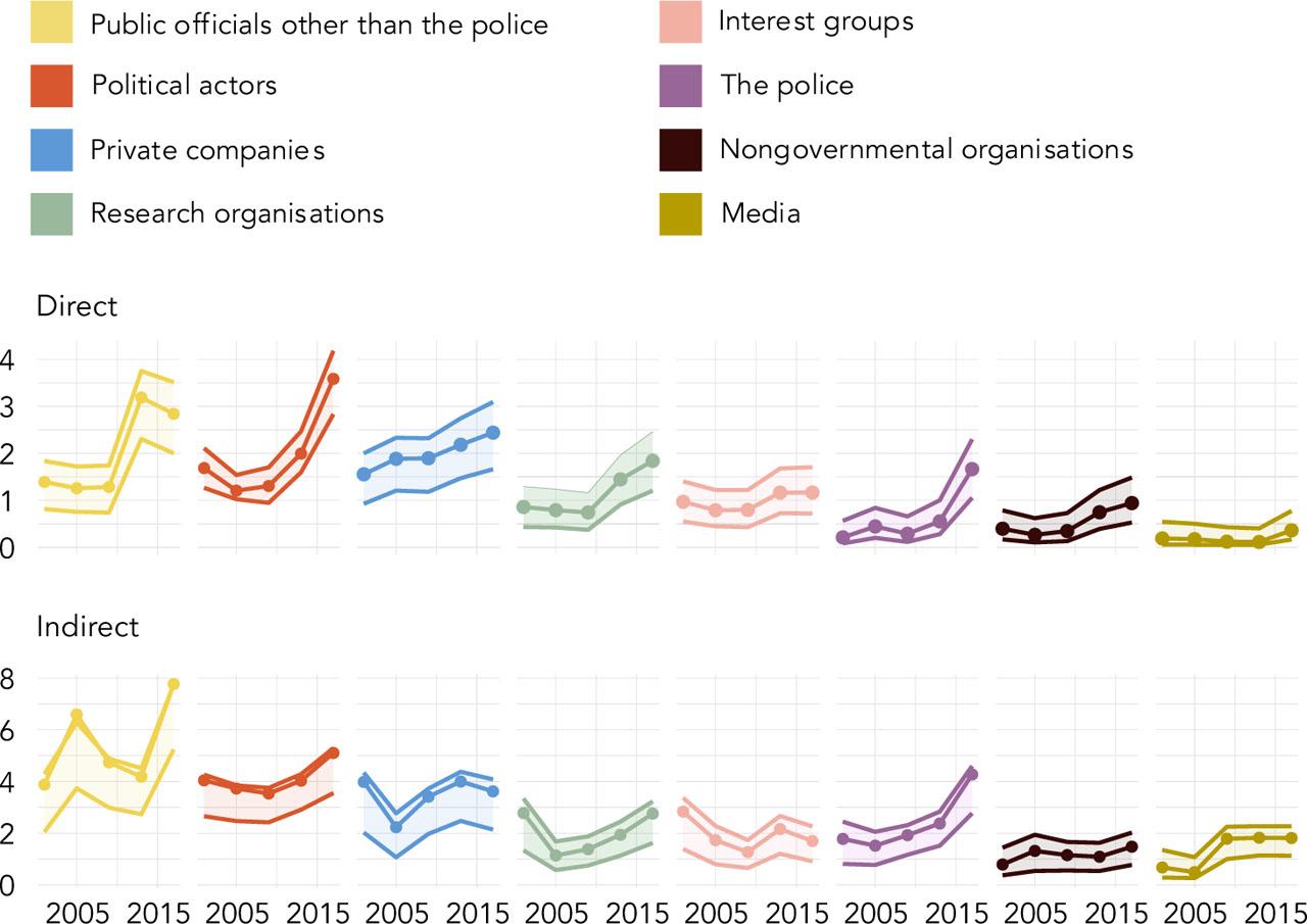 Among both direct and indirect quotes, the highest share of quotes comes from official governmental actors (notably, the police are separated from the other actors). In terms of absolute development, particularly the indirect quoting of government actors, and especially indirect but also direct quoting of the police, increased after 2010. For direct quoting of government actors other than the police, a phenomenon can be seen where direct quoting increases at the start of the online-first publication era, but not after that. In terms of proportional representation, while both quotes from the police as well as other officials increase on the whole, it is the quoting from the police that increases more, thus increasing their overall share of the quote pool at a particular time.