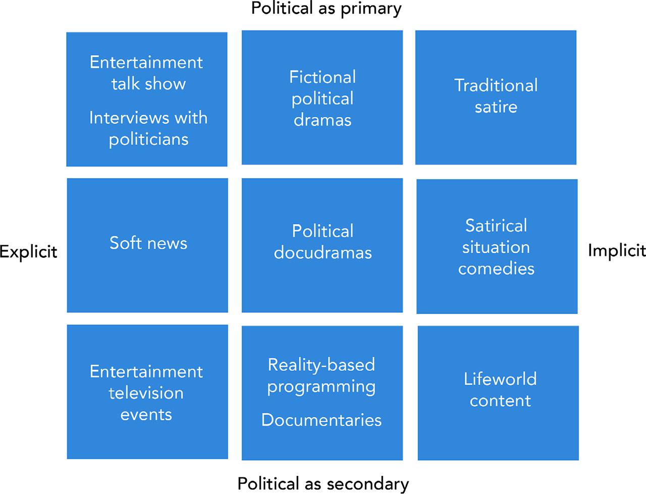 Efforts to understand the relationship between entertainment and politics often involve creating a research framework that identifies areas of inquiry, relevant questions, and empirical materials likely to yield insights into the intersections between the popular and the political. For example, Holbert’s nine-part typology (see Figure 1) focuses on content (“the nature of political messages in various entertainment outlets”) and reception (“how these content types influence audiences”), ultimately linking types of entertainment television to potential audience effects (Holbert, 2005: 437). The typology contains two axes, explicit–implicit and political as primary–political as secondary.