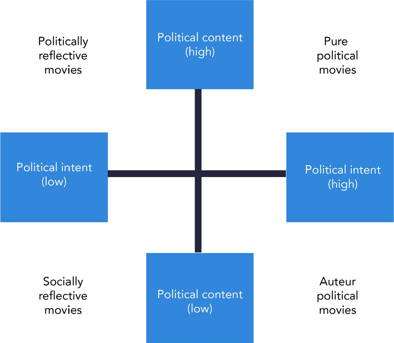 Street (2012) identified specific ways that popular culture engages with politics, that is, by representing the political (the portrayal of explicitly political topics), revealing the political (where politics is read into the text and is communicated as ideology), politically positioning the audience (framing reality in a specific way and by contributing to the construction of collective identities), and dramatising political morality (and motivating political action). Similarly, Coleman (2008) explored the meaning of politics within the context of representation in the soap opera genre. He proposed a three-dimensional model to reconcile the personal nature of fictional storylines with the visibility of politics in entertainment. The model includes process politics (depicting political processes, politicians, and structures); issue politics (addressing real-world political issues); and everyday politics (exploring interpersonal power dynamics within private life). Christensen and Haas (2005) developed a typology based on two axes – political content and political intent – to dissect political messages transmitted by fiction and to foretell their potential impact (see Figure 2).
