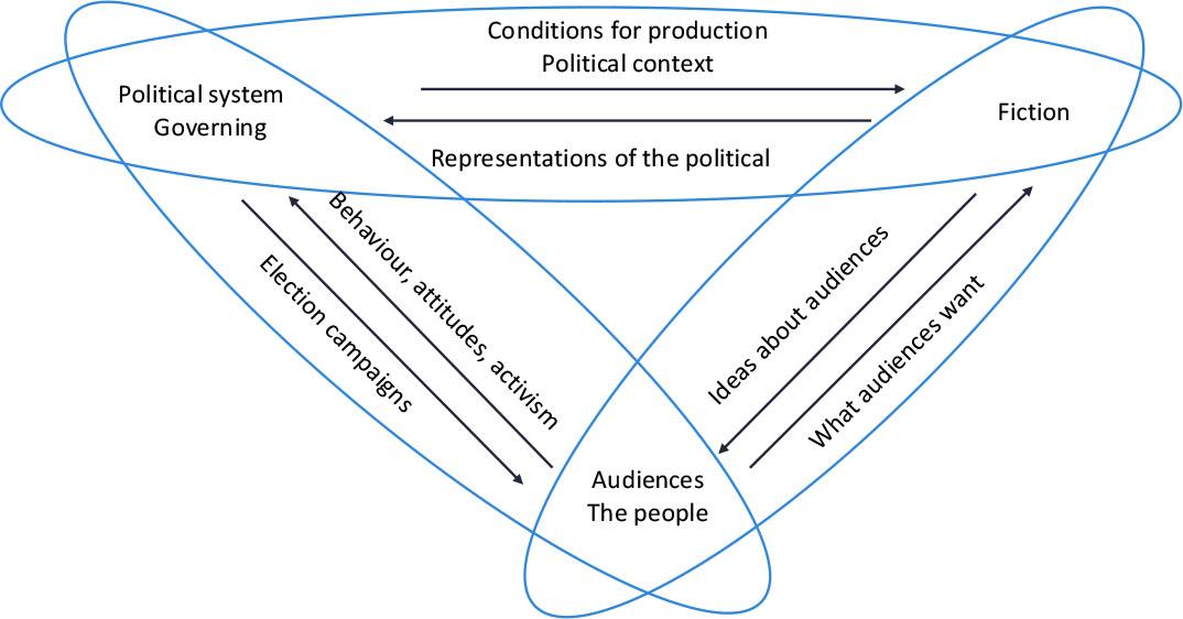 This introduction is followed by a discussion on previous attempts at structuring and conceptualising the relation between fiction and politics and a methods section. Three major sections ensue. The first discusses what characterises the studied literature in terms of disciplinary belonging of the authors, time of publication, and geographical context. The second delves into how the studied articles conceptualise democracy; this section is motivated by the fact that we found articles to be more inclined to discuss fiction and politics than fiction and democracy, even when their topics are clearly related to democratic processes, for instance, studying democratically elected leaders or political campaigns (see, e.g., Frame, 2016; Kato, 2015). The third section consists of three parts, each of which deals with one reciprocal relation in a triad, where the political system and politics, audiences (the people), and fiction constitute the nodes. Hence, in the first part we discuss politics and fiction and present articles that deal with how fictional representations of politics affect politics, as well as how the political context and the conditions this context creates for audiovisual productions affect fiction. The relationship between audiences and fiction is discussed in the second part, where we analyse to what extent conceptualisations of the audiences are agentic or not, as well as ideas about how fiction is influenced by “what audiences want”. In the third part we discuss politics and audiences, focusing on how fiction affects audiences’ political opinions, attitudes, and behaviour, including activism. Furthermore, we discuss how politicians use fiction in, for instance, election campaigns. The article concludes with a final discussion that summarises key findings and explores their broader implications.
