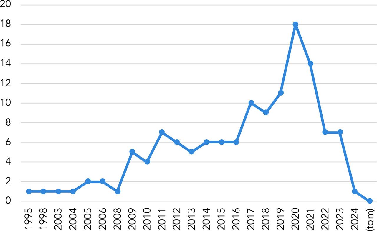 In this first section, we present metatextual information about the articles in our sample. Regarding the authors’ disciplinary affiliations, media studies – including television, film, animation, adaptation, and celebrity studies – are predominant, with just over half of our sample published in this field. The second-largest discipline is political science, which accounts for approximately 20 per cent of our sample. Another 15 per cent falls under area and language studies. The remaining 15 per cent is distributed among geography, cultural studies, history, geopolitics, fashion studies, sociology, criminology, psychology, and philosophy. Our selection ranges from 1995 to 2024 and there is a clear increase in the number of publications from 2008 onwards, peaking in 2020–2021 (see Figure 4).