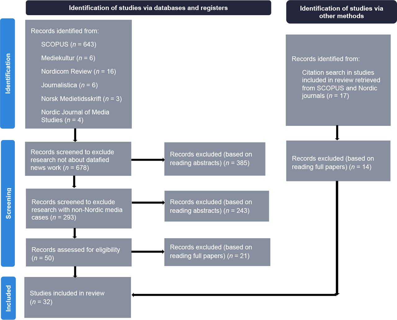 Taken together, these enquiries resulted in 678 potentially relevant publications. By reading abstracts and keywords, we screened each of these publications to extract those relevant for our purposes, dividing the work equally between us. In this process, we excluded literature reviews (since they would not contribute with new knowledge about the subject matter but, rather, synthesise existing knowledge), conference papers, publications without a Nordic focus, and “grey literature” (i.e., non–peer-reviewed publications like reports and whitepapers). These criteria mean that some publications are excluded from this literature review even though they do explore aspects of datafied news work (e.g., Andreassen, 2020; Jørstad, 2022; Lindskow, 2015; Ministry of Culture, 2017, 2024; Møller, 2022b, 2022a). Finally, we collected additional relevant literature through the bibliographies of the publications that made it through the screening process. The titles we identified this way then went through the same screening process as the publications we had initially found.