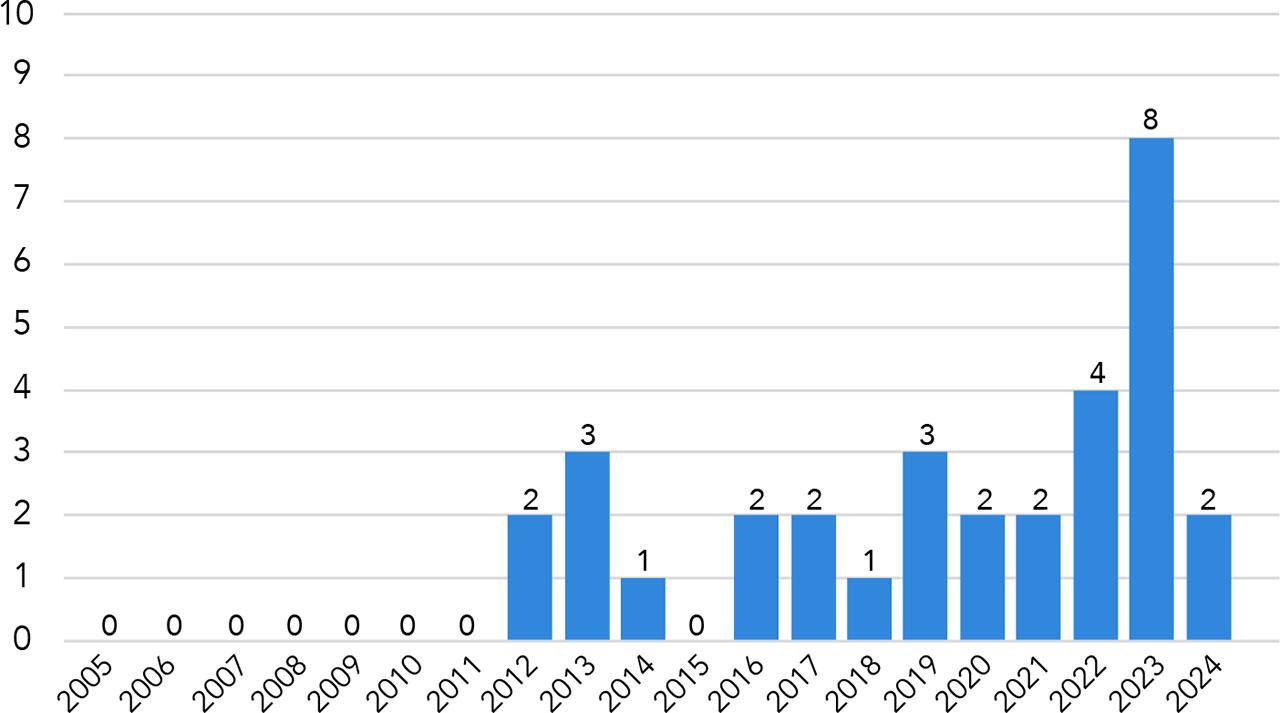 First, as Figure 2 shows, the number of publications on the subject increased over time with no or only few publications per year to begin with and more than half of the publications (18) published within the last five years of our time frame (2020–2024). This way, datafied news work appears to be a subject matter of increased salience in the research community.
