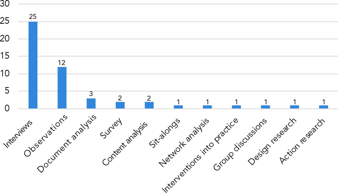 Third, across the reviewed literature, we find a clear preference for qualitative methods (see Figure 3); interviewing (25) stands out as overwhelmingly the preferred method, with observation (12) in a somewhat distant second place. All other methods are scarcely represented in the literature (with only three or less appearances), and they are typically combined with interviews, observation, or a combination of the two. There is a prevalence of mixed-methods approaches in the literature, as 14 of the 32 publications employ more than one empirical method. Quantitative studies that employ statistical or digital methods are almost absent (but see, e.g., Kammer, 2023a; Karlsson & Clerwall, 2013). This overall profile of the Nordic-focused research into datafied news work is likely due to methodological traditions in the field, and it is also likely that the most relevant questions at this stage of academic inquiry are simply best answered through qualitative inquiry.