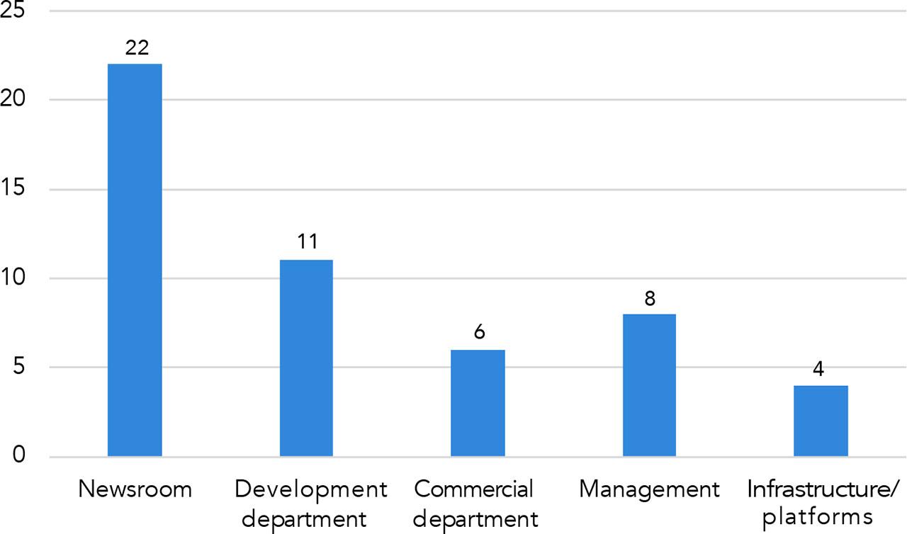 In answering these research questions, we use the model of the five spaces (Kammer, 2023b) as the structuring principle for the analysis. To better accommodate the model to the research literature, and to correspond with the typically situated character of the empirical research, we operationalise the spaces in terms of the physical spaces within the news organisations (newsroom, development, commercial, management, and on the outside) rather than in relation to the processes that take place there.