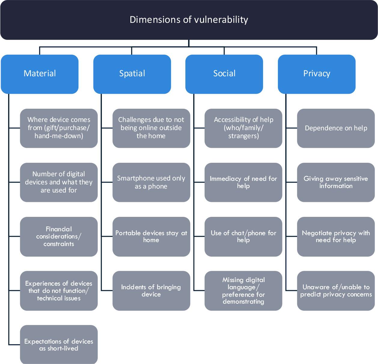 These older adults are vulnerable across various dimensions when using digital devices in everyday life. They do not experience having easy access to multiple services using a single device, as they frequently only use a device for one specific task. From a material perspective, the participants find digital devices to have short lifespans, and they dislike or cannot afford to invest in such short-lived products. From a spatial perspective, participants have devices that potentially offer versatility in terms of usage yet restrict their use to the confines of their homes, which makes them unable to utilise online services that are “on the go”. From a social perspective, the participants find online interactions challenging to manage and useful offline interactions hard to locate, which is a problem, particularly when they need technical assistance. They generally struggle to differentiate between devices and services, which makes it difficult to understand and formulate the issues they are experiencing and the type of assistance they require. Finally, individuals make themselves vulnerable by balancing privacy and convenience by granting others access to their services and passwords. Considering the complexity and many dimensions where digital devices are now relevant, this study offers an emic perspective on everyday life as a lens to tease out how digitalisation is a meta-process of varied social change (Krotz, 2014) that also makes vulnerability multi-dimensional. These findings indicate that digital vulnerability may be hard to detect, yet it can be substantial and manifest at multiple levels in various situations.