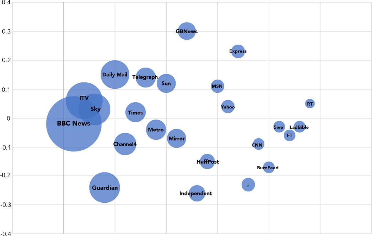 Polarisation of media in the UK, compound of brand scores across off-and online news media