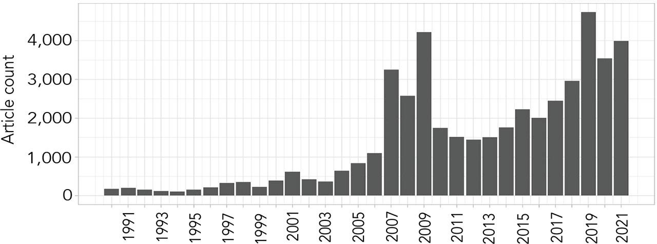 We have addressed the research questions by examining the national press in Denmark. The sample frame includes print and digital news from national dailies currently in print circulation (n = 7) as well as online news from national broadcast organisations (n = 2). Data were collected automatically via API access to a digital media archive (Infomedia), and it encompasses all published news stories from 1990 to 2021 that include at least one of three keywords related to climate change (Greenhouse effect [drivhuseffekt] OR Global warming [global opvarmning] OR Climate change [klimaforandring]). Duplicates and news items shorter than 100 words were removed, resulting in a corpus of 46,462 articles. Figure 1 displays the yearly distribution, which closely follows a similar pattern seen in global climate change reporting (Boykoff et al., 2024).