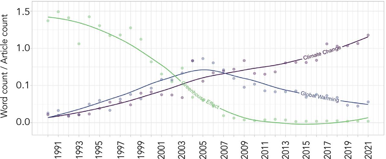The current study investigates how the three terms have changed over 30 years of public climate change reporting in Denmark. We explore how news media (newspapers and public service broadcasters) have employed different terms from both a longitudinal and a semantic perspective. More specifically, we use computational methods (Grimmer et al., 2022) to map and analyse evolving patterns in how public communication discusses anthropogenic climate change through the terms for the greenhouse effect, global warming, and climate change. The main research question is: How have the prevalence and meanings of the greenhouse effect, global warming, and climate change developed in public climate change communication?
