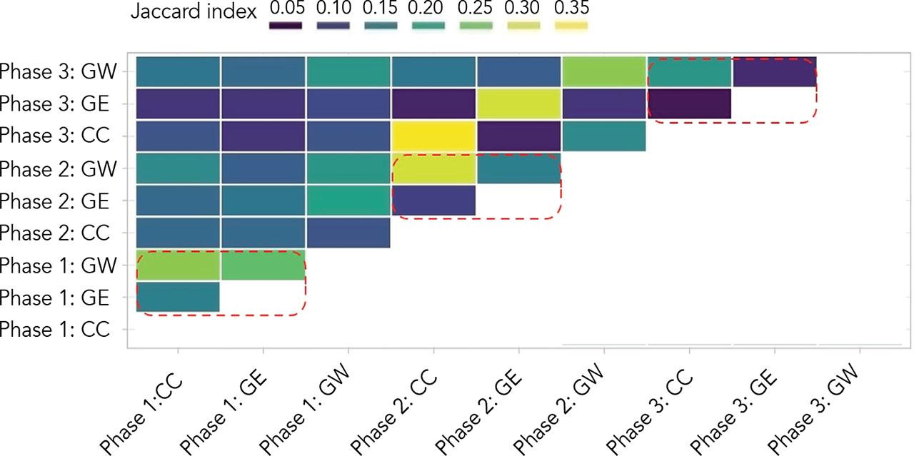 Detecting semantic similarities and differences across publishing periods is not feasible via cosine similarity, given the word vector method we chose. Instead, we have used the Jaccard index, a measure of similarity and diversity of sample sets. We identified the 50 most closely associated terms within each period (using cosine similarity) and examined the overlap between keywords and publishing periods. Put simply, we addressed questions such as, for example, what proportion of words related to climate change in phase 1 are identical to words related to the greenhouse effect in phase 2. The greater the overlap in words, the higher the Jaccard index (see Figure 3).