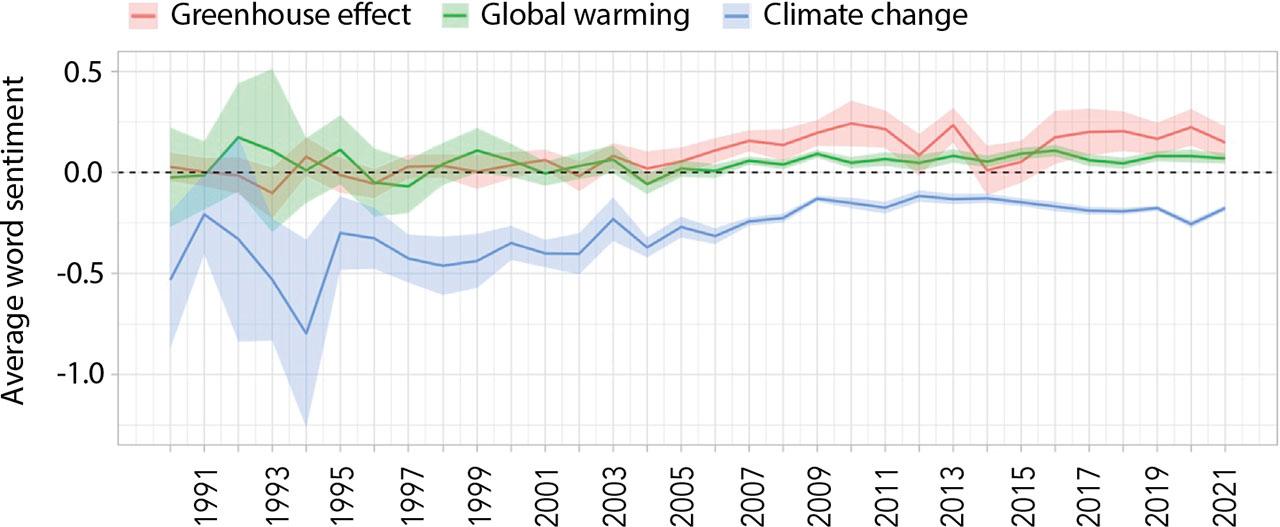 The negative sentiment associated with CC answers RQ3 negatively. There is no evidence supporting the hypothesis that CC is linked to less negative sentiments than GW. Our findings suggest the opposite. Among the three keywords, CC is the most negatively charged term: It emphasises the impacts of climate change rather than its causes, and it highlights a broader range of unforeseen consequences and feedback mechanisms. CC thus goes beyond the simpler concept of GW, indicating that climate change disrupts the entire Earth system with unpredictable challenges and knock-on effects. If anything, CC appears to have expanded public discussions about the meaning and impact of climate change, rather than limiting the debate to “less emotional” topics.