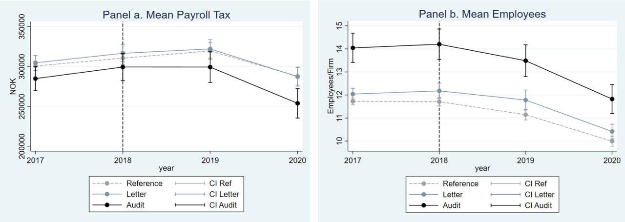 Notes: This figure plots point means and 95% confidence intervals from payroll tax remittance (in NOK), and the number of employees for years 2017 to 2020. The treatment, either audits or letters, takes place in year 2018, as visualized by the vertical, dotted line. The black line represents the annual mean of the audit group, the blue line represents the annual mean of the letter group, and the dotted line represents the mean of the reference group. The 95% confidence intervals are represented by the vertical error bars for each group.