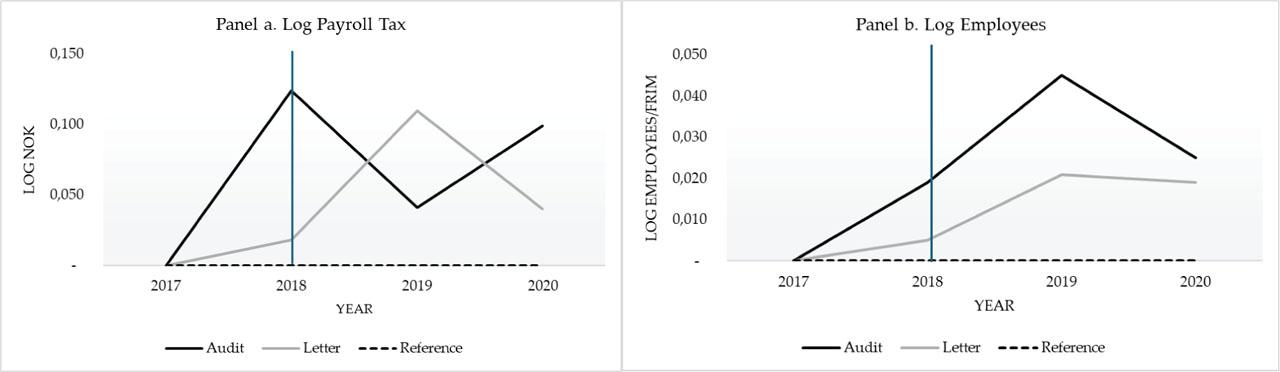 The two treatments may affect a firm's reporting liabilities other than the payroll tax. Revenue, salary expenses, and number of employees (workforce) may be affected by both the audit and the letter treatments since these are specific items contained in both treatments. We have run all the models in this paper with revenue, salary expenses, and number of employees as dependent variables as well, but we find no major deviations from the main model using payroll tax remittance as the dependent variable. Audits may affect payroll tax remittance through both better documentation on the payroll tax itself, but also through better documentation of sales and other variables. We are estimating the total effect of all these possible channels, cf. correlation matrix in Appendix Table A4. Nevertheless, as we are interested in a comparison with Bjørneby, Alstadsæter, and Telle (2021) on employee effects, we keep the number of employees as a dependent variable alongside the analysis of the payroll tax.