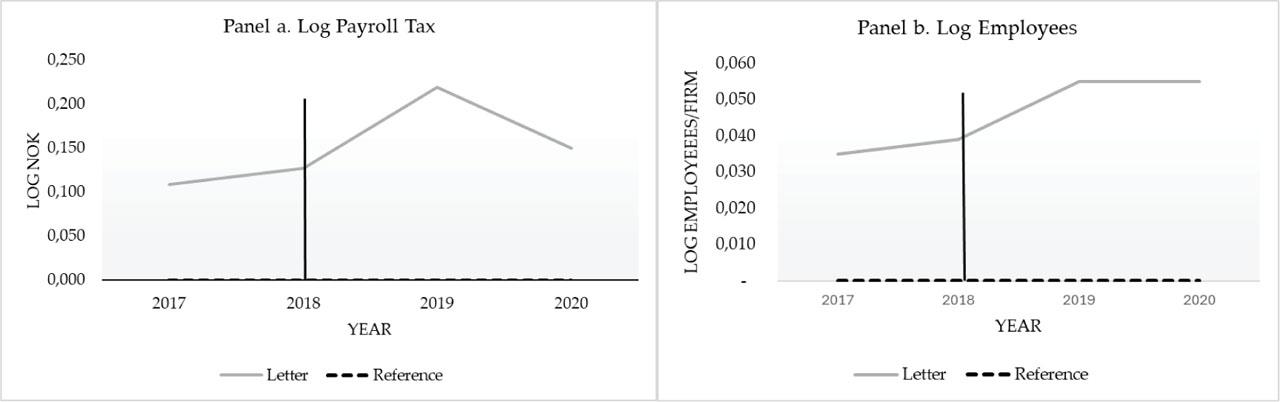 Notes: This figure plots point estimates from annual letter regressions of measures of logged payroll tax remittance and logged number of employees for the years 2017–2020, compared to the reference group (x-line). The treatment takes place in the year 2018, visualized by the vertical line. The grey line represents the estimated coefficients of the letter group compared to the reference group, represented by the dotted line. Standard errors are adjusted for 22 clusters in strata. Table A6 in the Appendix displays the coefficients and their standard errors.