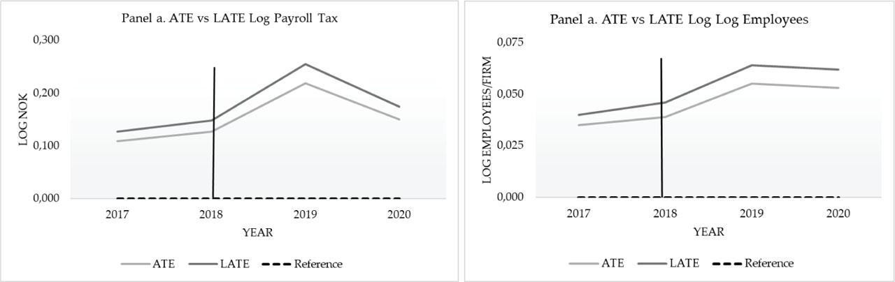 Both in the treatment year 2018, and the post-treatment year 2019, we observe that the compliers report significantly higher payroll tax (.148 and .255 log points, equaling 16.0 and 29.0 percent, respectively) and number of employees (.046 and .064 log points equaling 4.7 and 6.6 percent, respectively) compared to the reference group. The effects seem to remain for two years post-treatment (2020). Furthermore, the statistically significant estimates may indicate that being assigned to the letter treatment is a strong instrument of actually being treated.