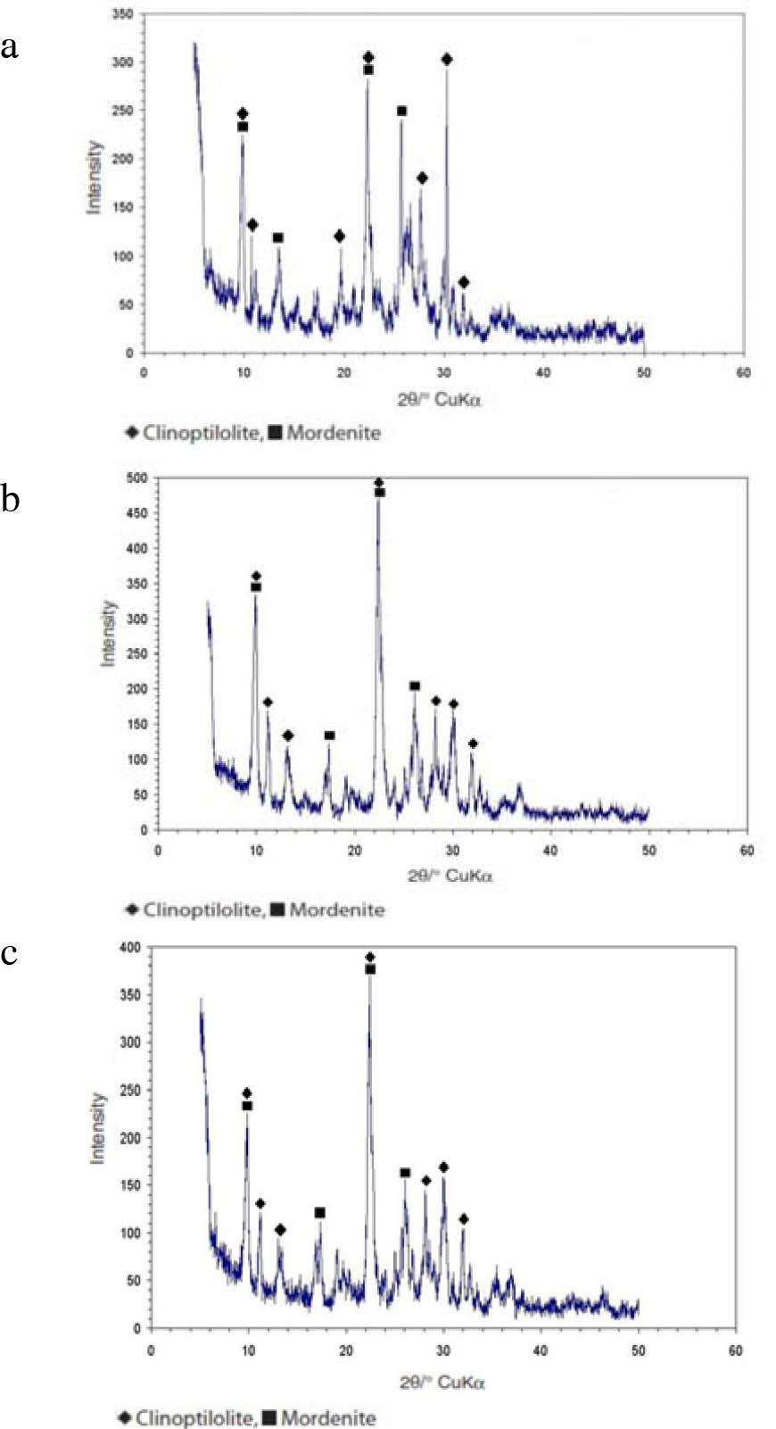 XRD peak pattern of the natural zeolite dried at 200°C: (a) Bayah, (b) Lampung, and (c) Tasikmalaya.
