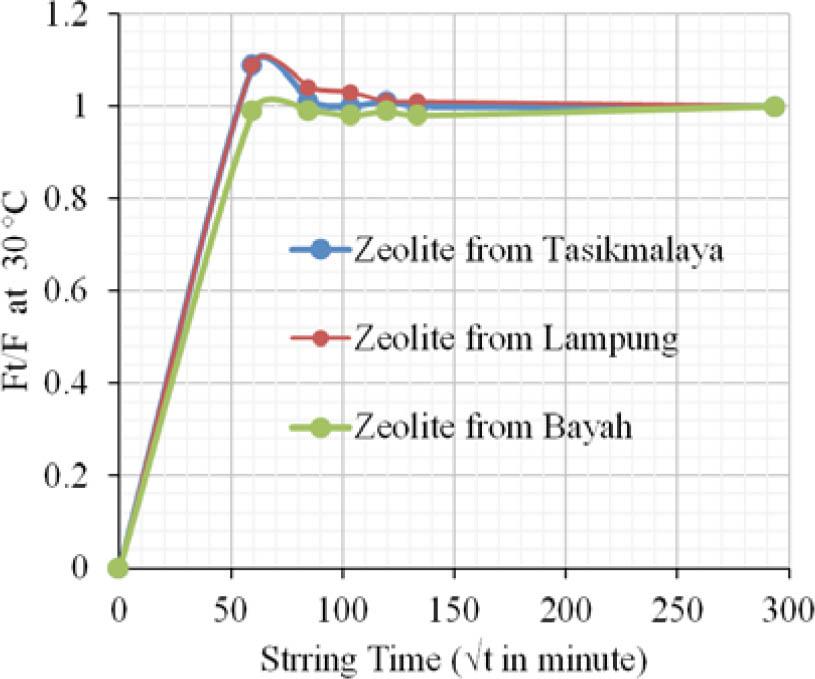 The diffusion coefficient (Di) of zeolites from Bayah, Lampung, and Tasikmalaya was determined in a manner similar to how CEC was measured. The ion exchange process was conducted using contact durations of 1, 2, 3, 4, 5, and 24 h at temperatures of 30°C and 50°C. The weight fractions of the Cs ions (Ft/F~) variables with contact durations during the ion exchange process and the rate of Cs sorption into the zeolite are listed in Tables 5 and 6.