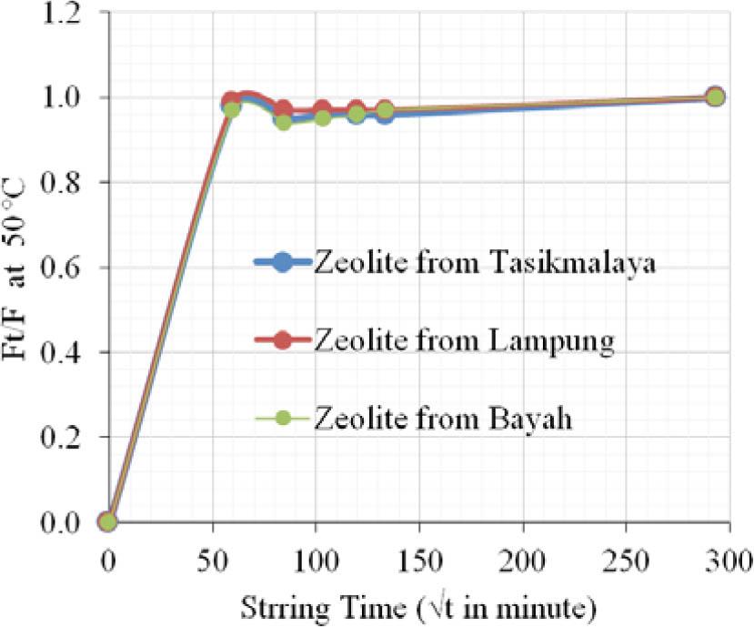 Figures 3 and 4 show that the zeolite from Lampung had a higher sorption rate than those from Bayah and Tasikmalaya, but the difference was not very large. The Di values for the three types of natural zeolite at temperatures of 30°C and 50°C are listed in Table 7.