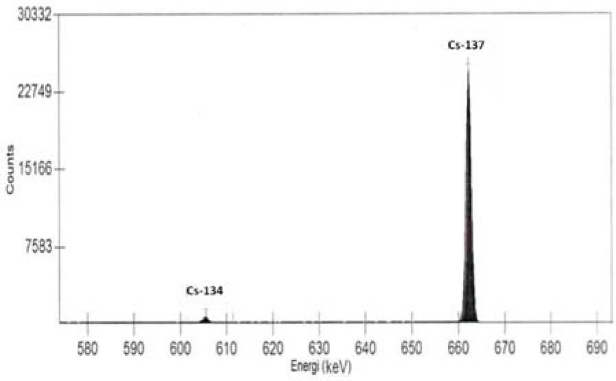 Figure 6 shows the isotopes spectrum of 134Cs and 137Cs bound in the solid phase at 604.7 keV and 661.7 keV, respectively. The isotope content of 134Cs obtained by measuring cesium using a gamma spectrometer is very small while the content of 137Cs is very large. This is due to a half-life of 134Cs of only around 2.1 years and 137Cs of around 30.17 years.
