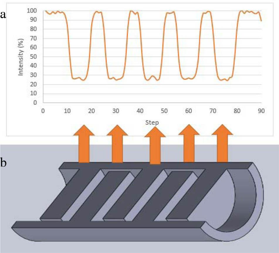 Figure 6 shows a plot of the gamma ray intensities, which corresponds to the densities of the materials of the column internals. The low gamma ray intensity regions indicate attenuation by the steel trays, and the high-intensity portions indicate the spaces between the trays. Figure 7, reproduced from [26], is a part of an experimental density profile obtained from a distillation column scan in an oil refinery using NaI(Tl) detector and 60Co having an activity of 50 mCi. The comparison between Figs. 6 and 7 demonstrates that the simulation result is credible.
