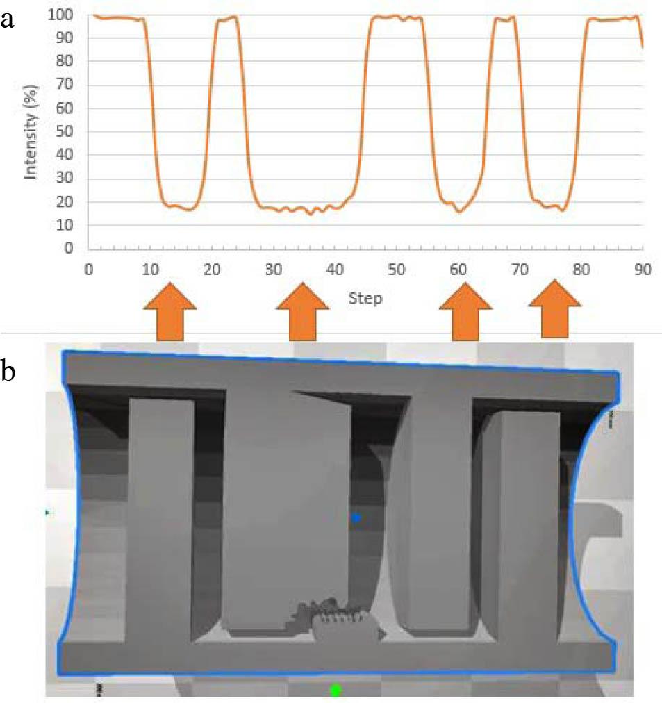 If the pattern of the high gamma ray intensities is changed, it would mean an anomaly caused by a high-density material such as a collapsed tray or liquid buildup. Figure 8a shows the results of scanning a column with a collapsed tray, which means that the space between Trays 2 and 3 is packed with the metal (Fig. 8b), increasing the area in which gamma ray is attenuated (Steps 30–43).