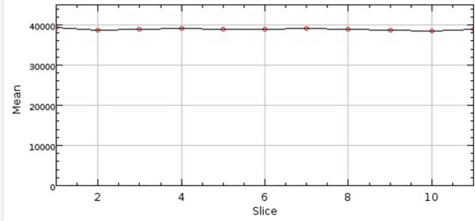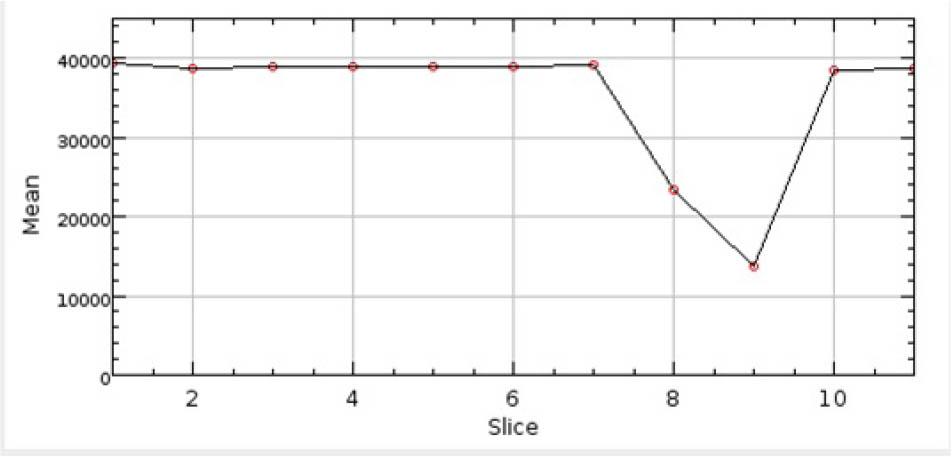Figure 9 shows the result of the pipe scan simulation, where the material inside the pipe is distributed homogeneously, resulting in a continuous line. Figure 10 shows the density profile when a solid phase is deposited to disturb or block the flow. The decrease in the intensity between the slices 7 and 10 can be used to describe the deposits’ location, density, and area. Figure 11 illustrates the application of gamma scanning for the detection of blockages in pipes. The comparison of Fig. 11 with Fig. 10 shows that the virtual laboratory offers adequate results in this application.