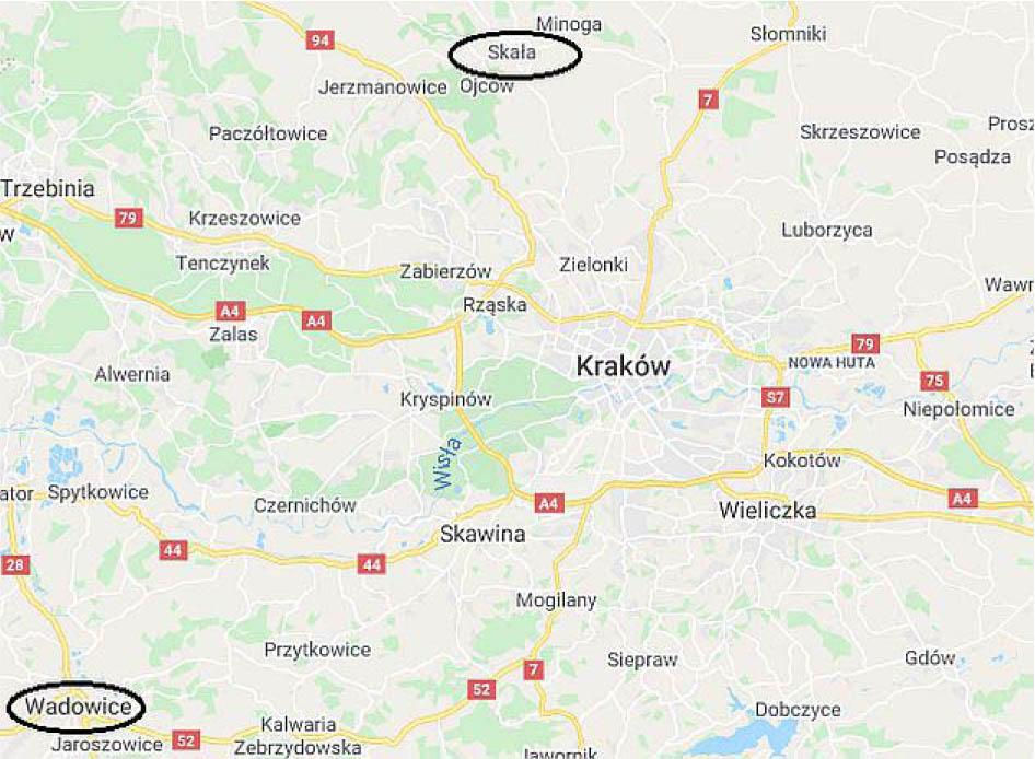 Skala is a small town located 50°23′N and 19°85′E, between the Ojcow National Park in the southwest and the Dlubnia Landscape Park in the southeast. It covers an area of 2.97 km2 and has a population of 3801 people. Skala is located on the slightly undulating Jurassic plateau. In its upper layer, Jurassic limestone and chalk marl covered with clay can be found. Moreover, the city is directly adjacent to the Ojcow National Park, where chalk deposits are located. Skala is a densely built-up commercial and residential area, located at a junction of major roads. Heating is provided mainly by domestic furnaces, tiled stoves, and electrical devices.